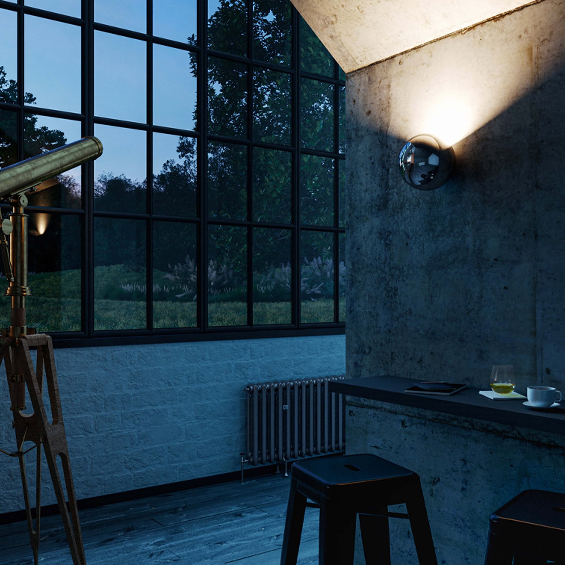Catellani & Smith's new Sfera W lamp is inspired by the famous Escher self-portrait, capturing the observer's reflection. The spherical mirror reflects the surrounding environment, even when switched off, providing an illuminating effect. To create a variety of light effects or amplify the interplay of reflected images, Sfera W can be used individually or in multiple compositions.
