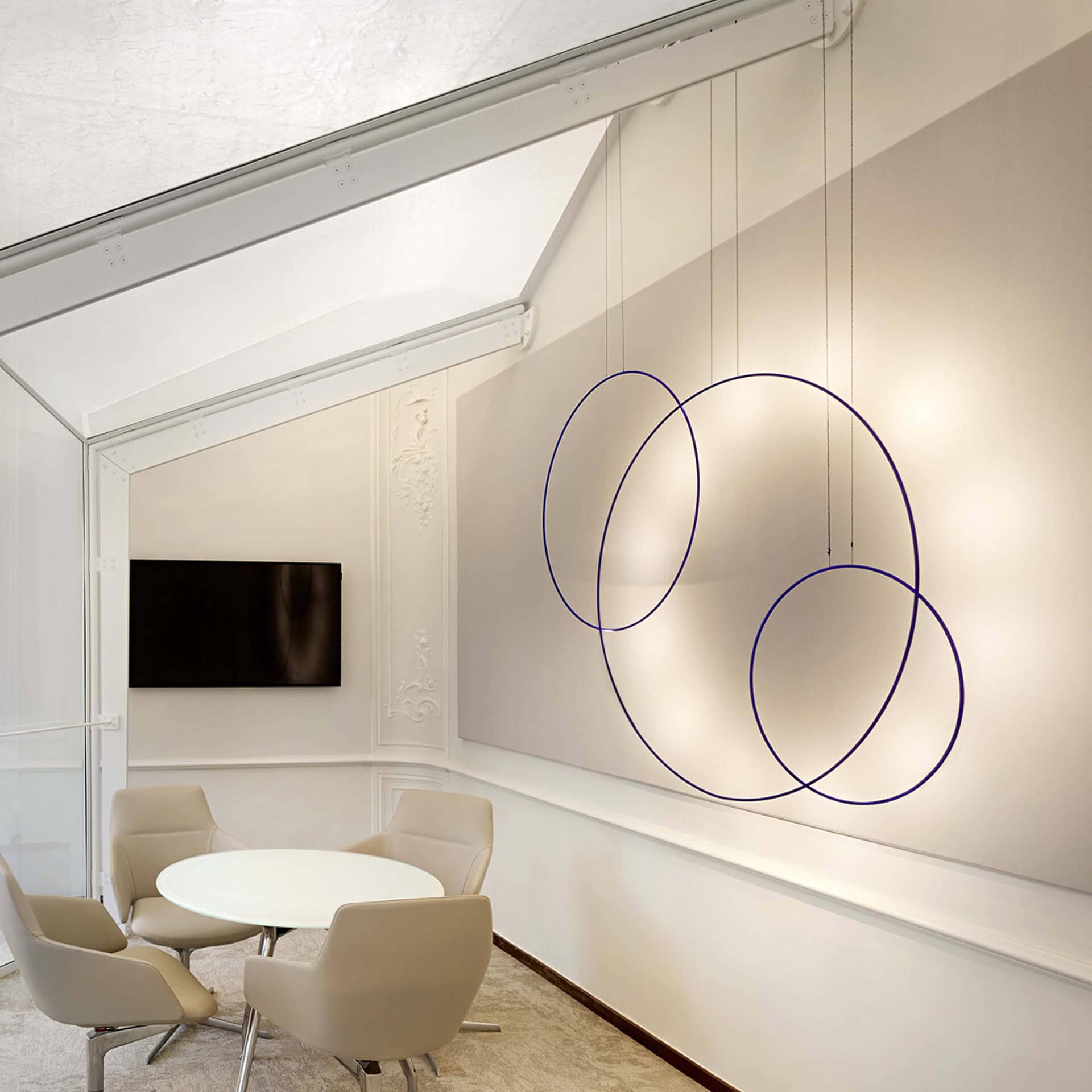 Modern circular chandelier with multiple rings and integrated lighting, enhancing contemporary livin.