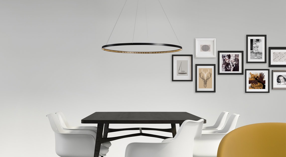 The Circle 80 is a pendant light that provides direct and indirect light. Made of an epoxy painted steel circle, this light features an electronic transformer with 110/220 volts and a remote control dimmer switch from 0 to 100%. Available in a range of shades. Warranted to meet or exceed industry standards
