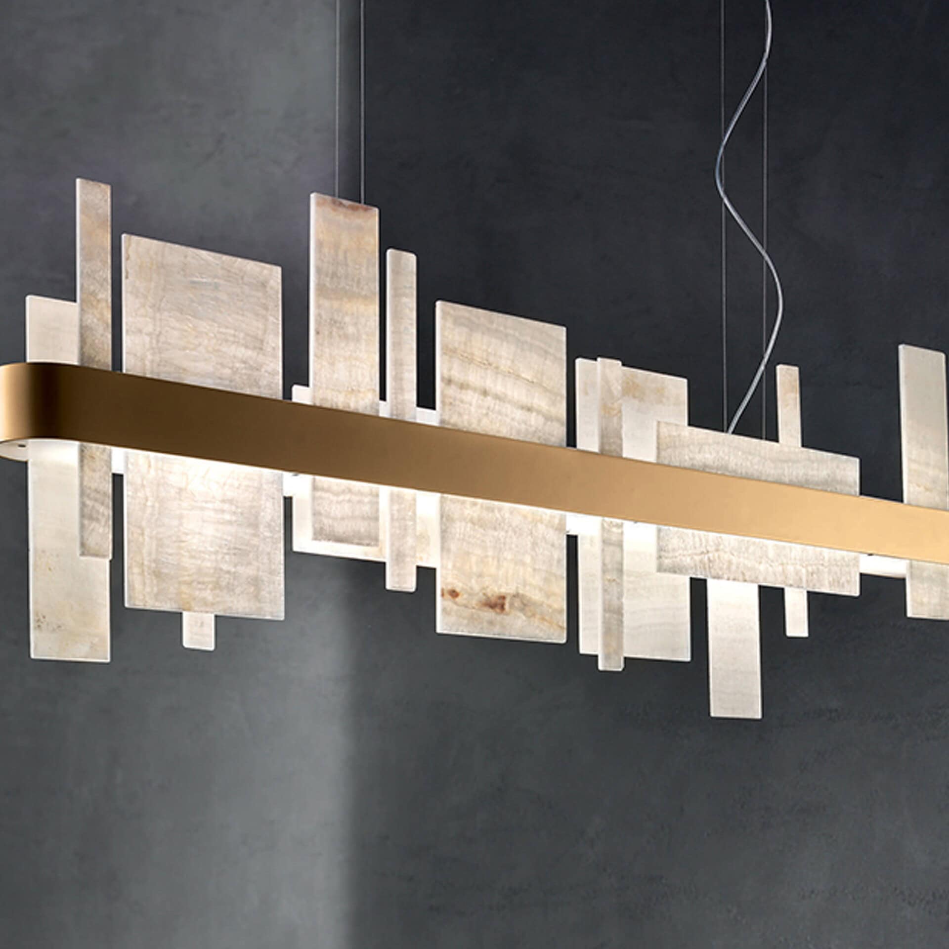 Featuring striking rectangular onyx diffusers of varying sizes vertically and horizontally attached to a linear frame with curved endings, this pendant light is suspended from a cable and finished in an opaque gold finish for a modern and minimalistic look. Choose from either a small or medium size to fit your space and enjoy the warm, inviting ambiance that this unique pendant brings. The Honicé Linear Suspension is ETL listed, ensuring the highest safety and quality standards.