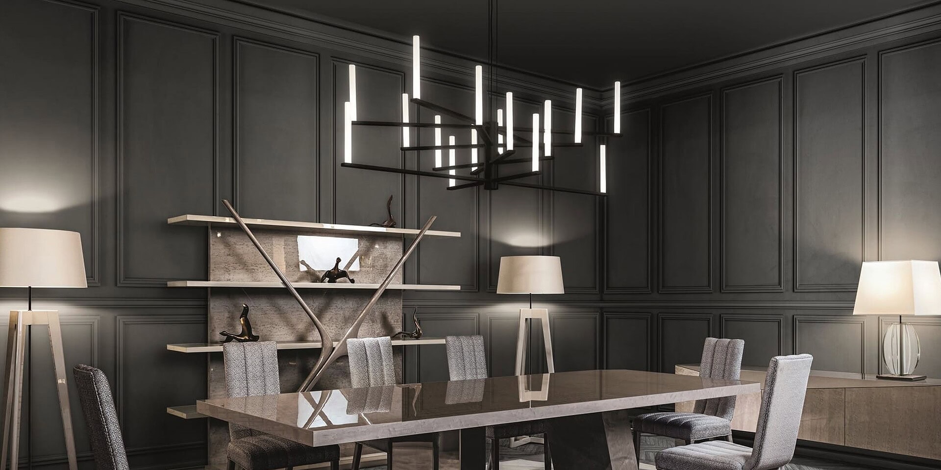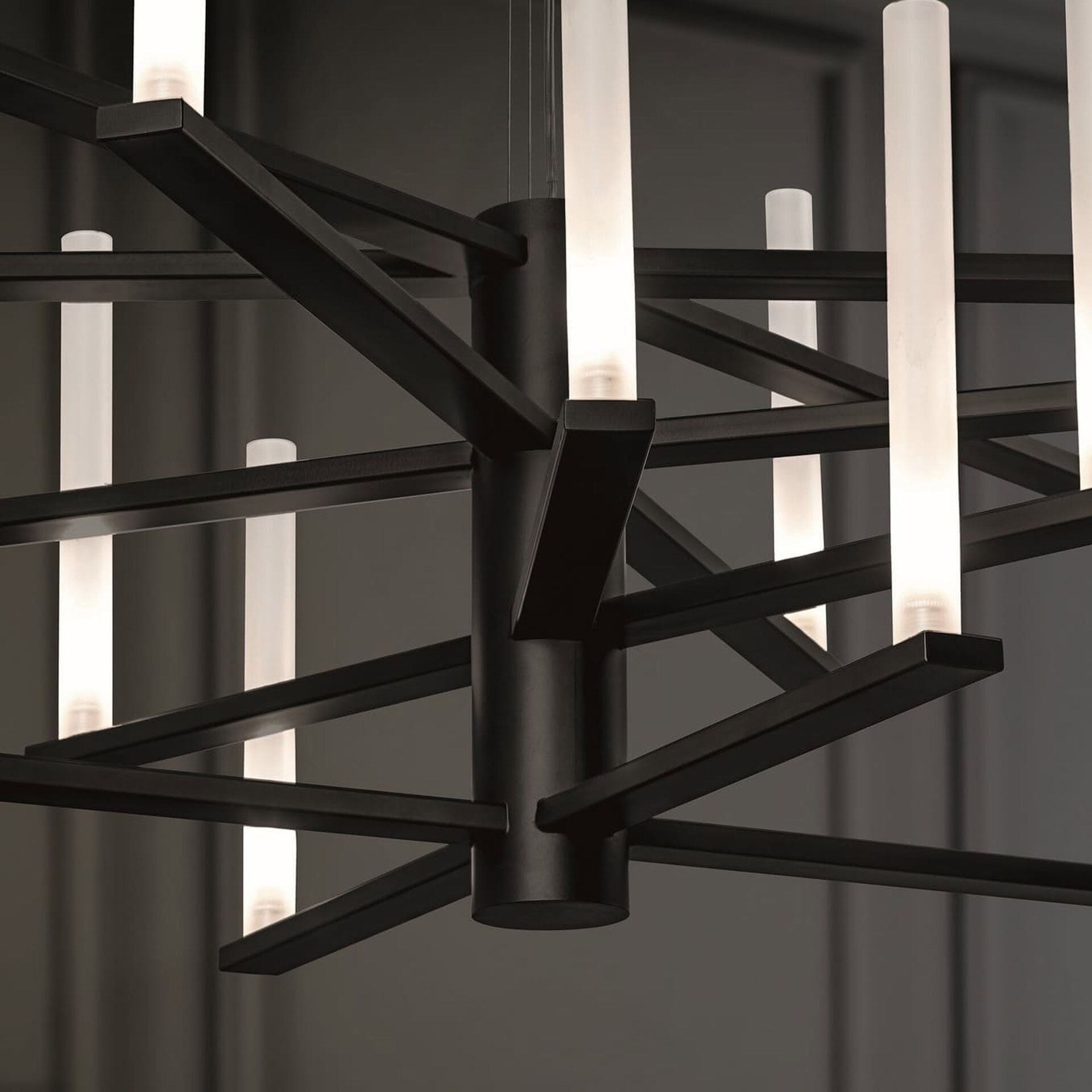 The Horizon Chandelier has an elegant frame with 14 acid-etched glass elements that add decoration. Its linear design is filled with style. The black-painted metal ceiling light fixture is ominous and perfectly contrasting. This striking piece works beautifully above your dining table or anywhere else you want to add stylish lighting.