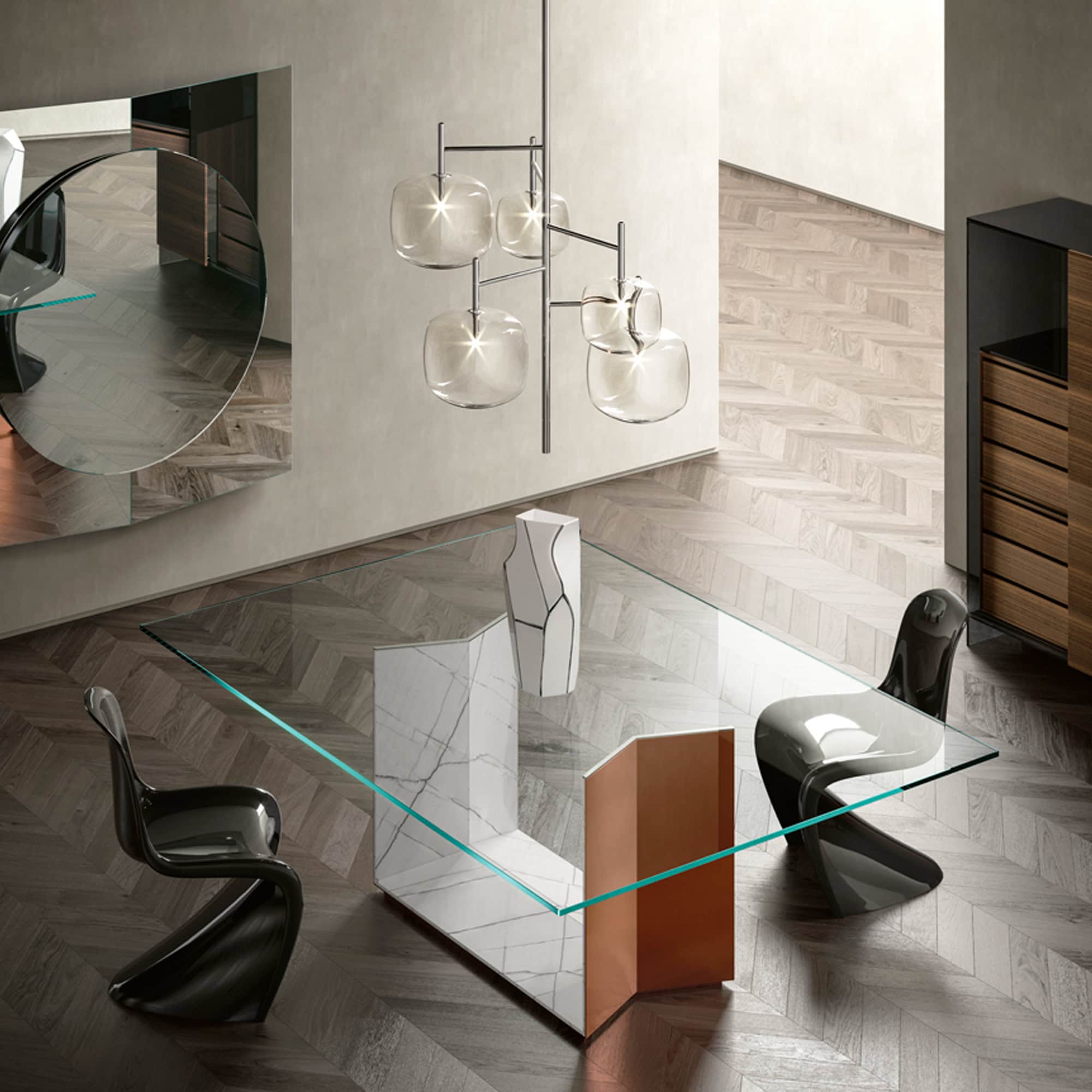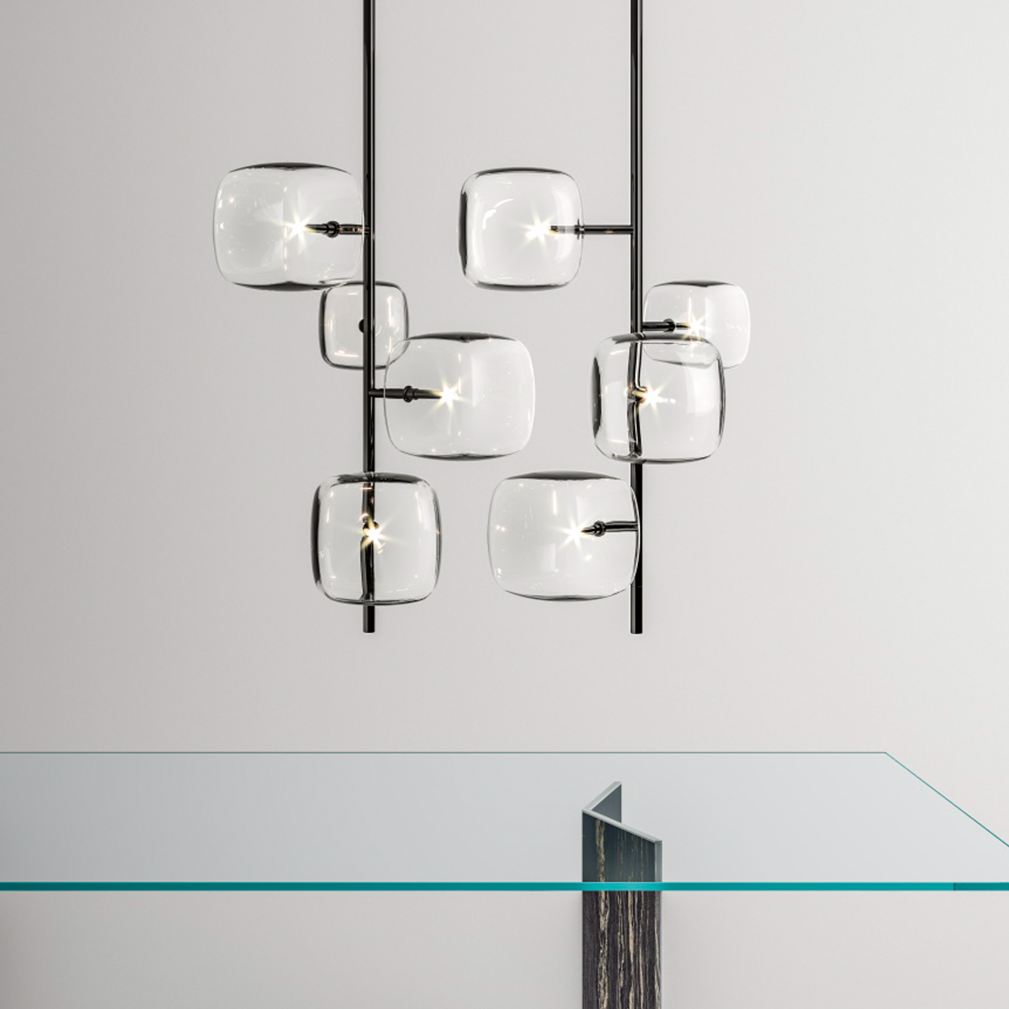 The Hyperion Chandelier by Tonelli Design is a captivating suspension light that blends contemporary artistry with Italian craftsmanship. Designed by Massimo Castagna, this striking piece is available in two distinct configurations—four pendants suspended directly from the main frame or five pendants elegantly hanging from extended arms. The transparent blown Pyrex glass cubes create a dazzling interplay of light, while the clean, architectural frame offers a refined presence over dining tables, kitchen islands, or entryway settings. Both versions convey a timeless yet modern elegance, appearing almost weightless as the pendants seem to float in midair.