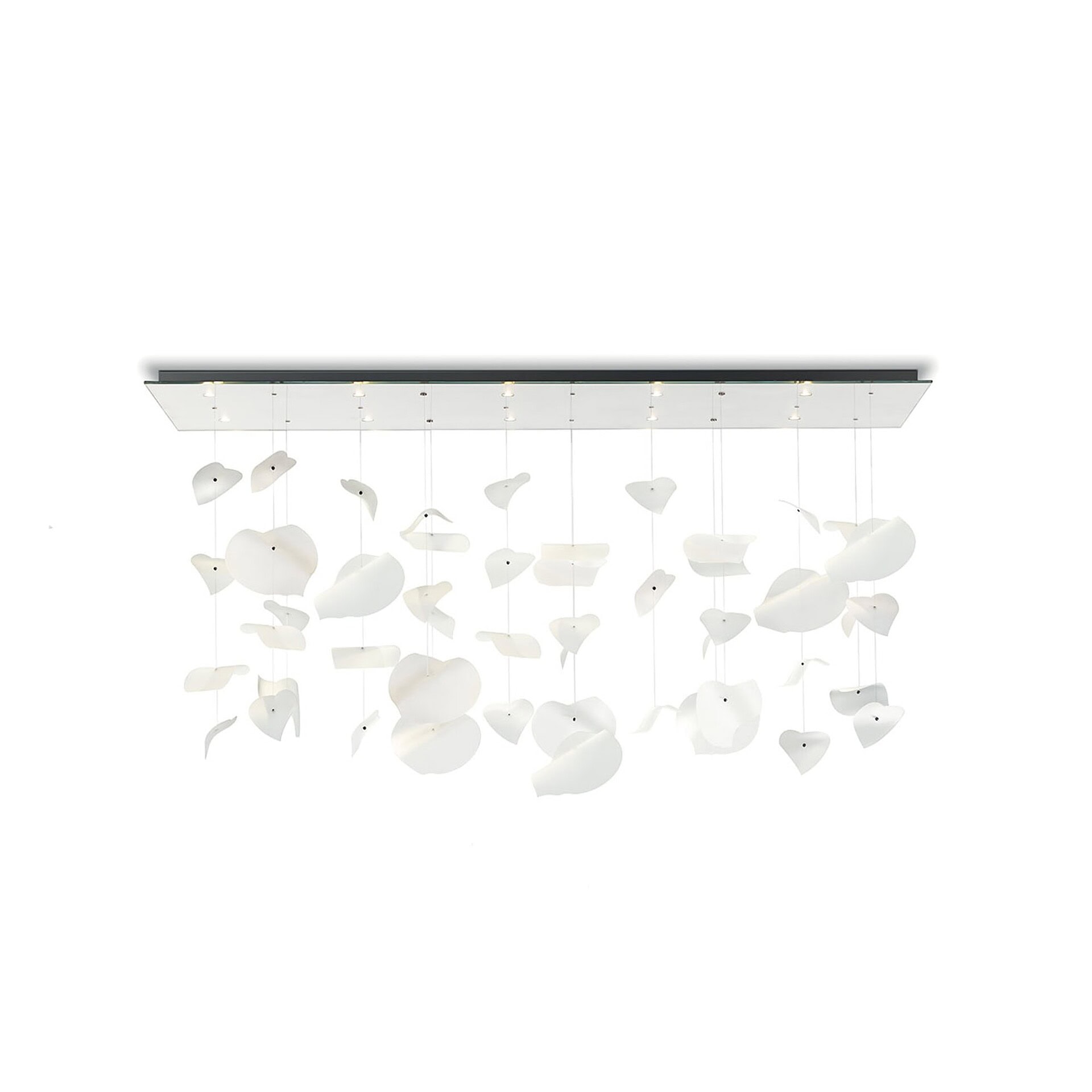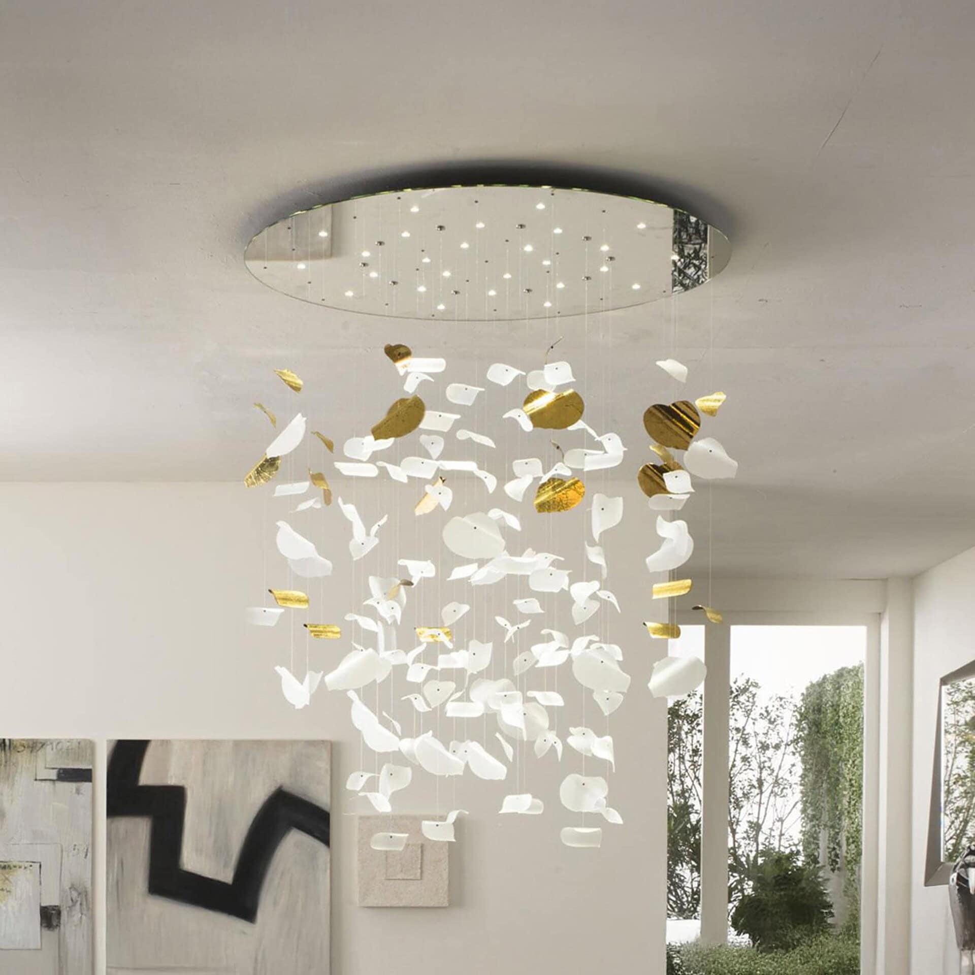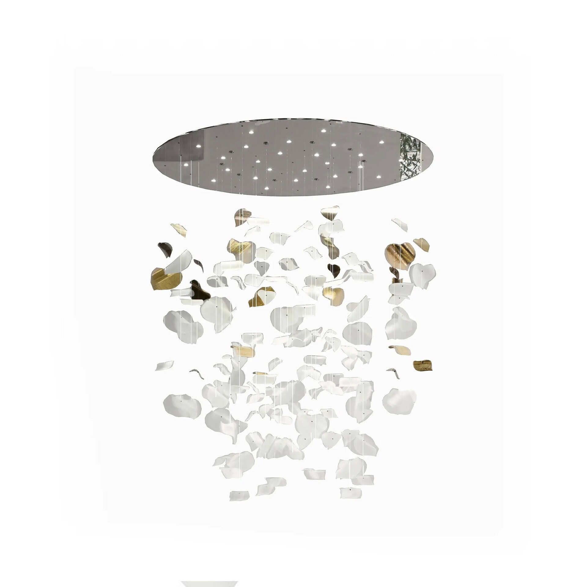 The Leaf Chandelier is a striking contemporary lighting piece that transforms any space into a poetic landscape of floating forms. Designed by Reflex, this sculptural ceiling fixture features an arrangement of hand-shaped etched glass leaves suspended from a mirrored glass base with built-in LED lighting. Each leaf is unique, arranged at varying heights to create a sense of organic movement. Whether installed over a dining table or in a grand foyer, the Leaf Chandelier becomes a centerpiece that adds elegance, softness, and dimensionality to its surroundings.