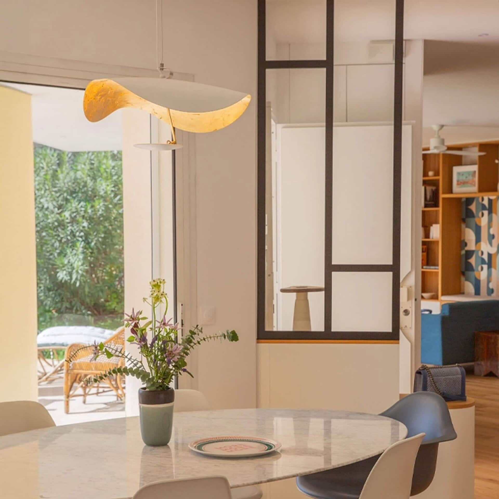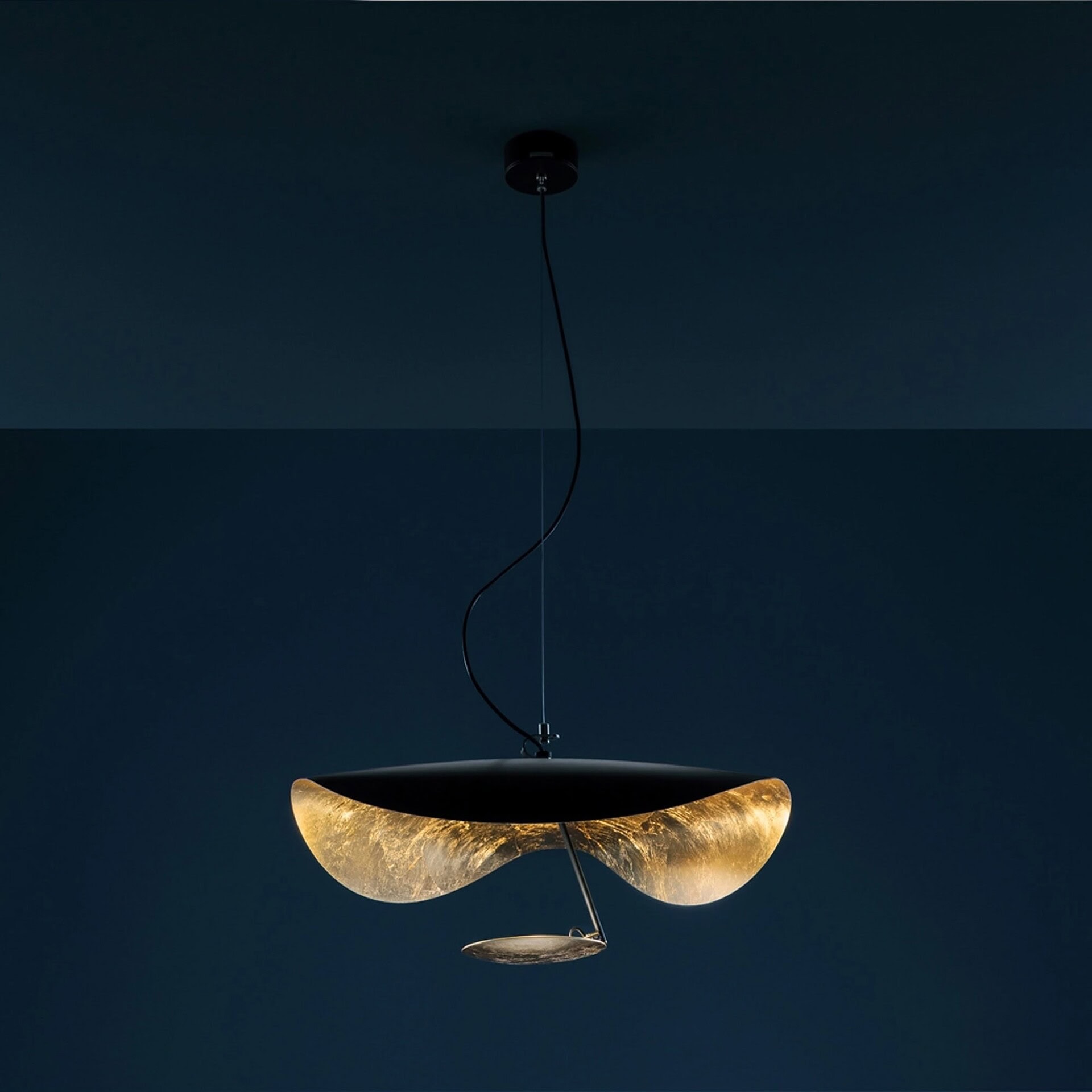 Available in a range of refined combinations, the Lederam Manta S1 offers the following palettes: black shade with gold or copper leaf accents and a matching black rod and base; white shade with a white varnished disc and either a gold or white rod; and white shade with gold leaf detailing, paired with a satin rod and white disc.