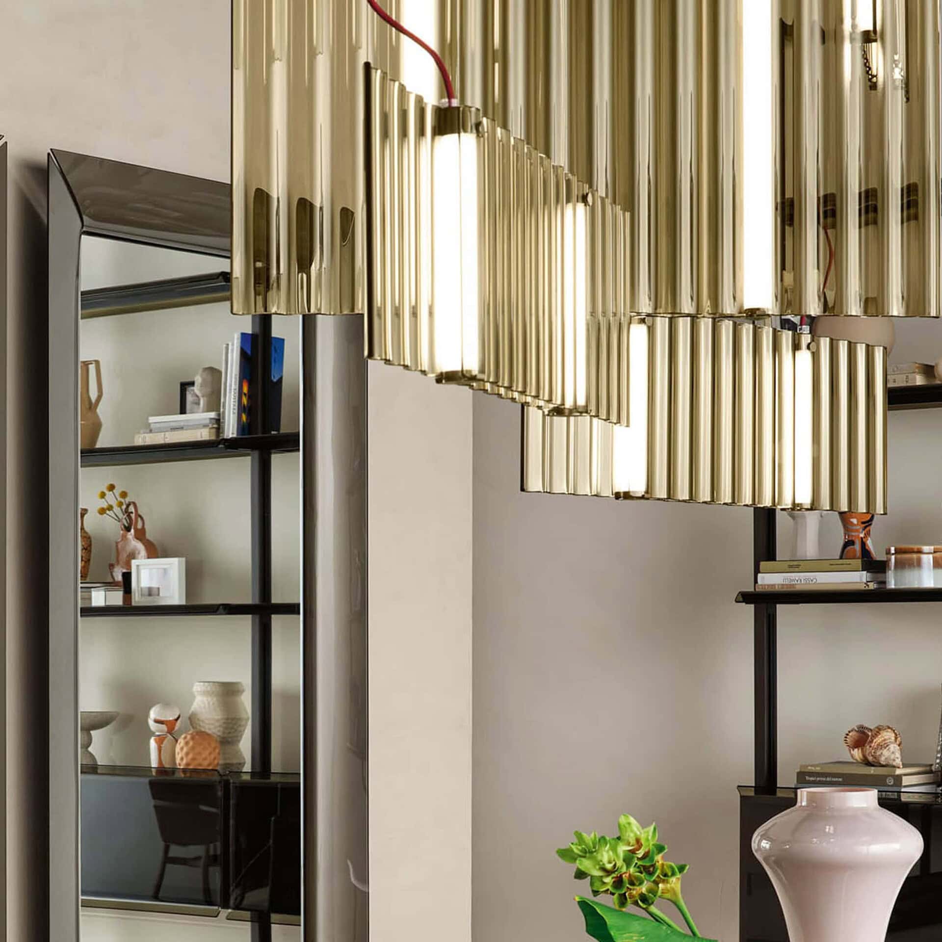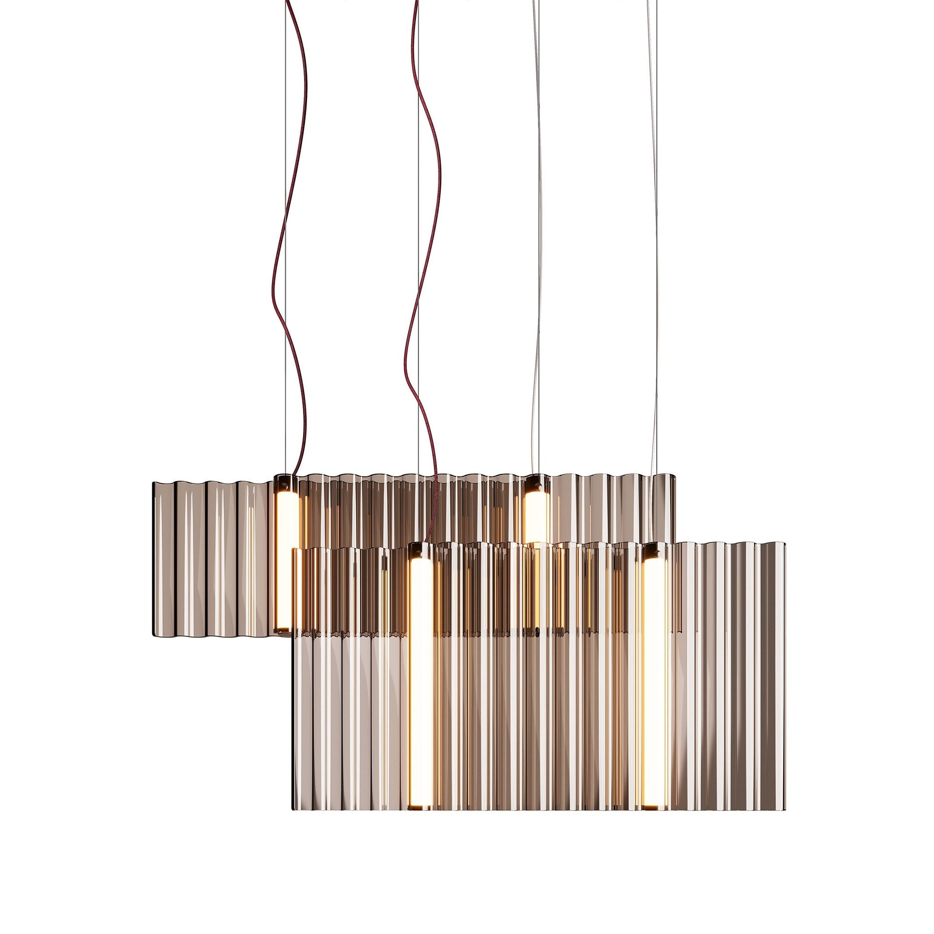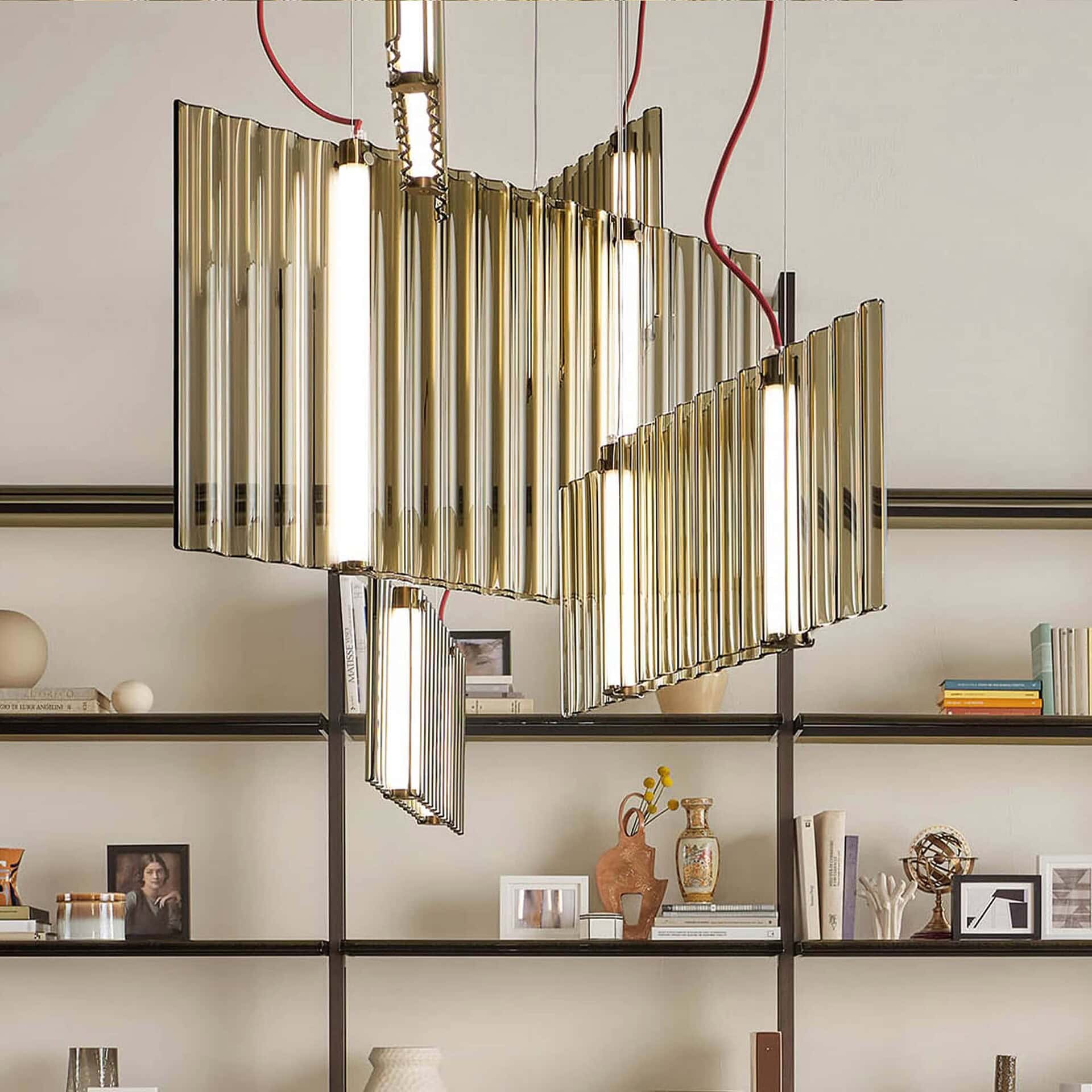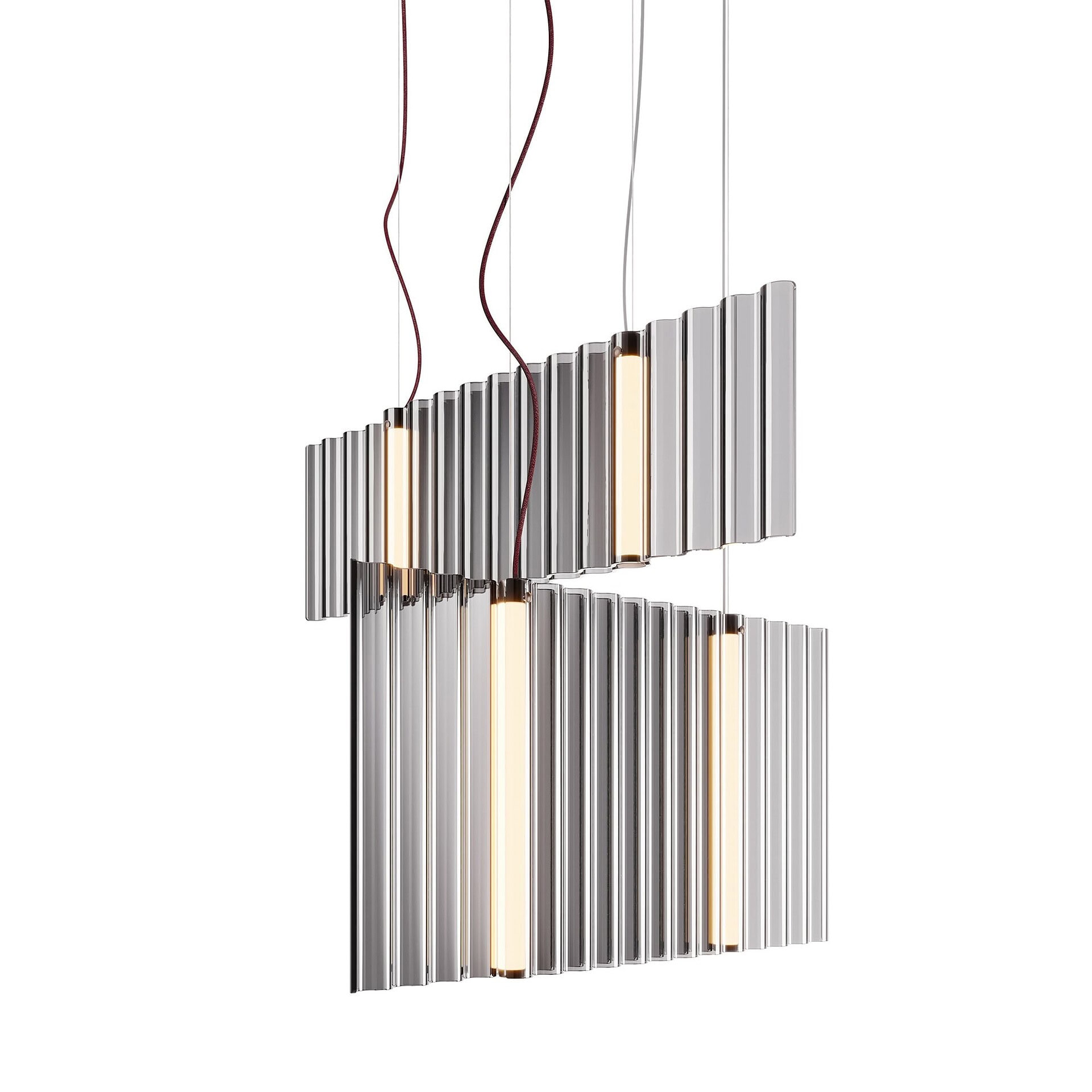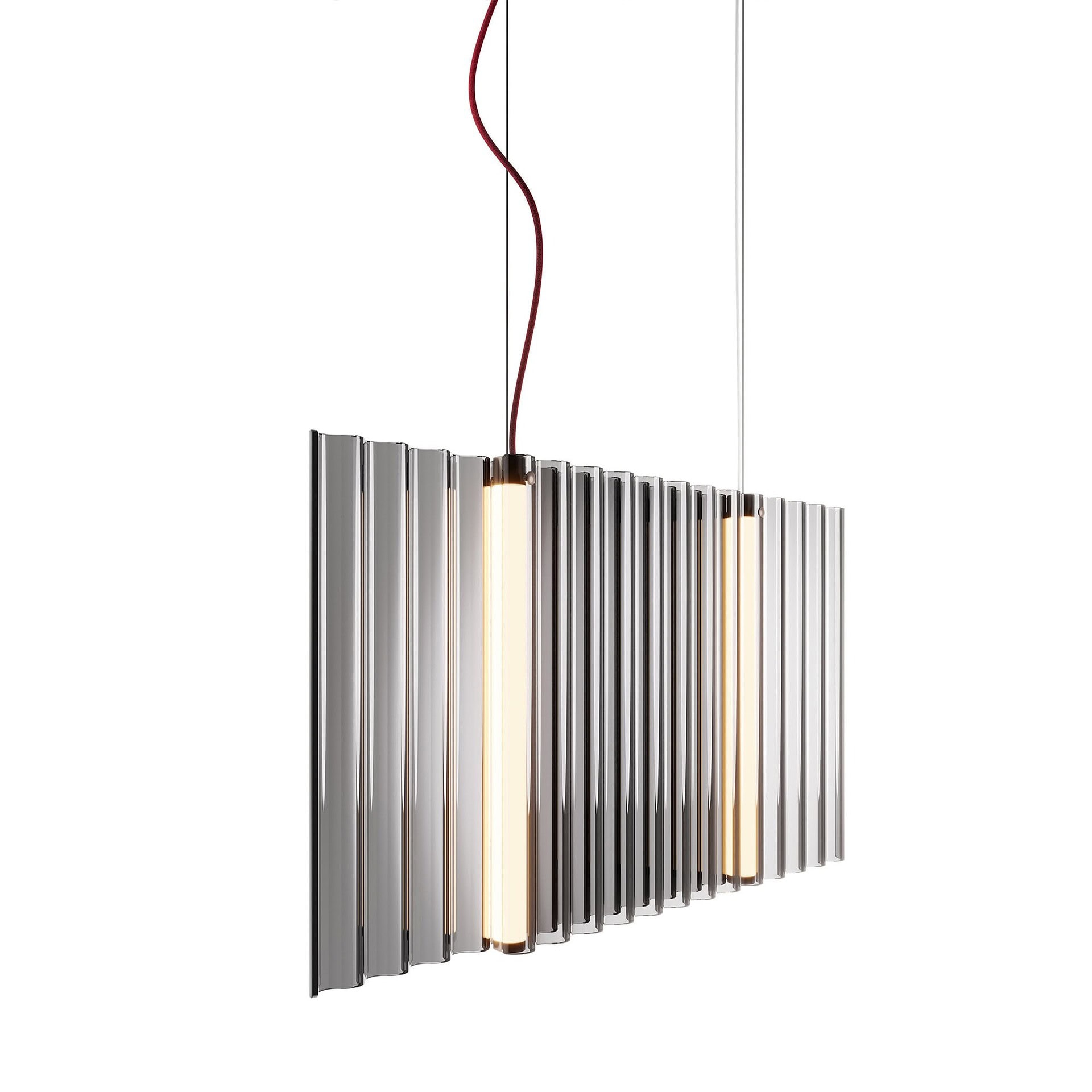 Each element of the Sipario is crafted with elegance—from the metallic greige structure to the deep bordeaux red silk-effect cable. This balance of refined detailing and functional performance makes the Sipario not only a striking design feature but a practical lighting solution that enhances the ambiance of any modern interior.