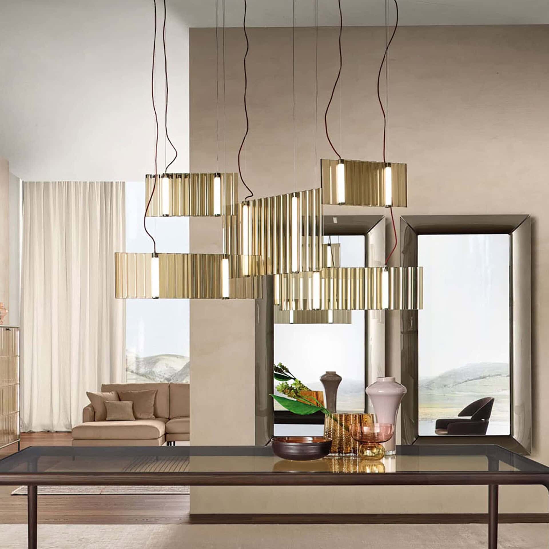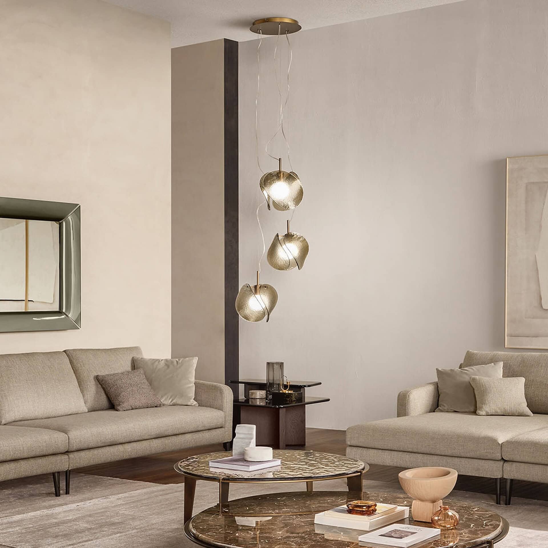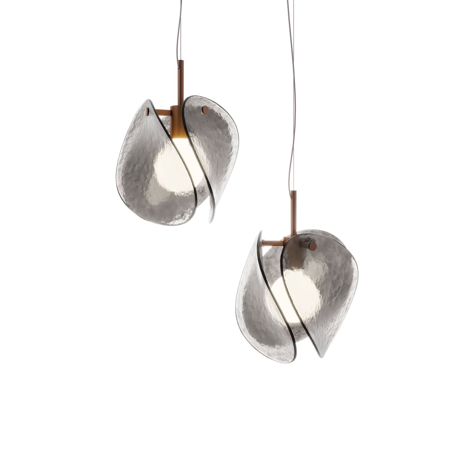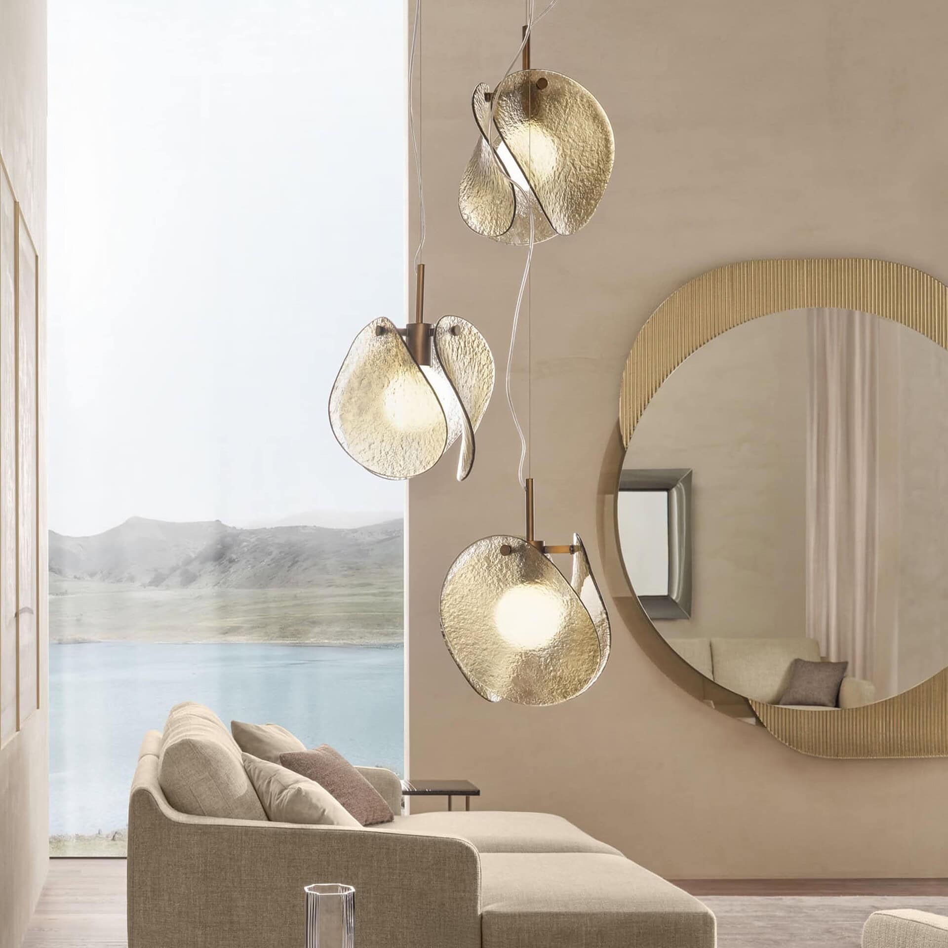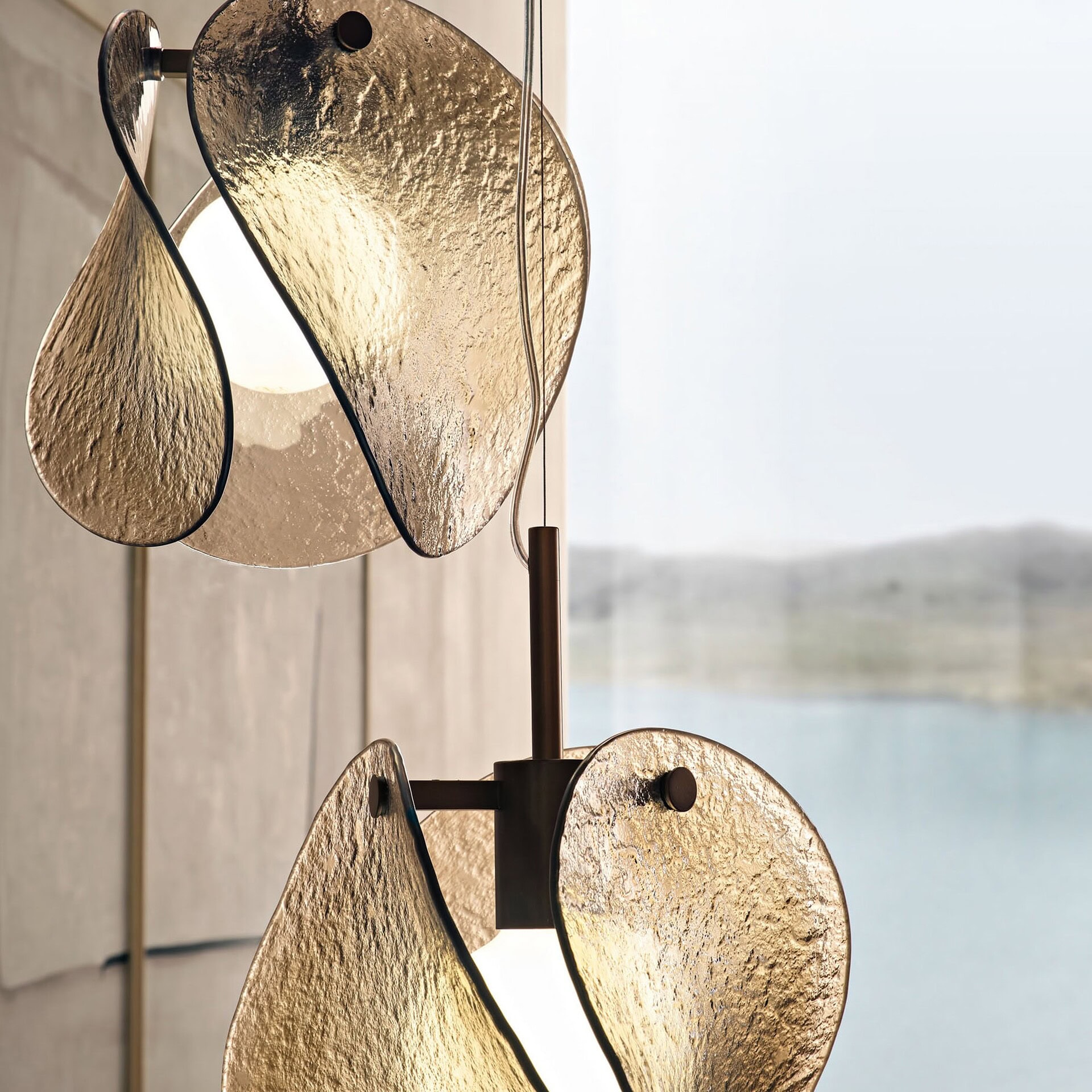 This pendant is anchored by a burnished brass metal structure, available in single or multi-light configurations (2, 3, or 4 lamps). The diffuser comes in either a smoky grey or warm bronze finish, complementing a range of palettes and styles. The Tau is compatible with E27 bulbs (not included), and each lamp can be adjusted during installation up to a hanging length of 300 cm, allowing flexibility in placement and composition.