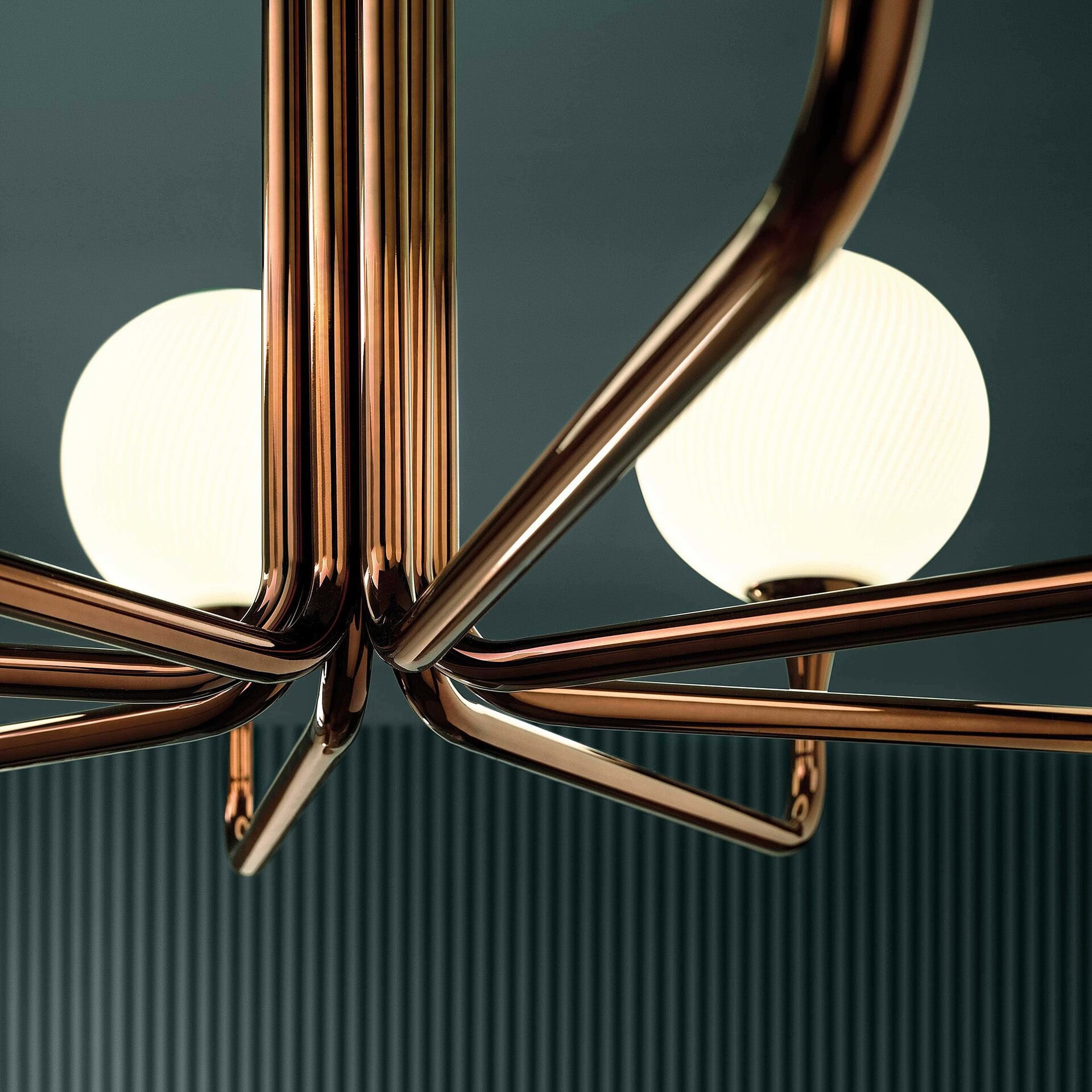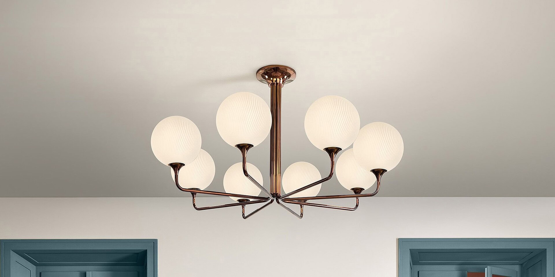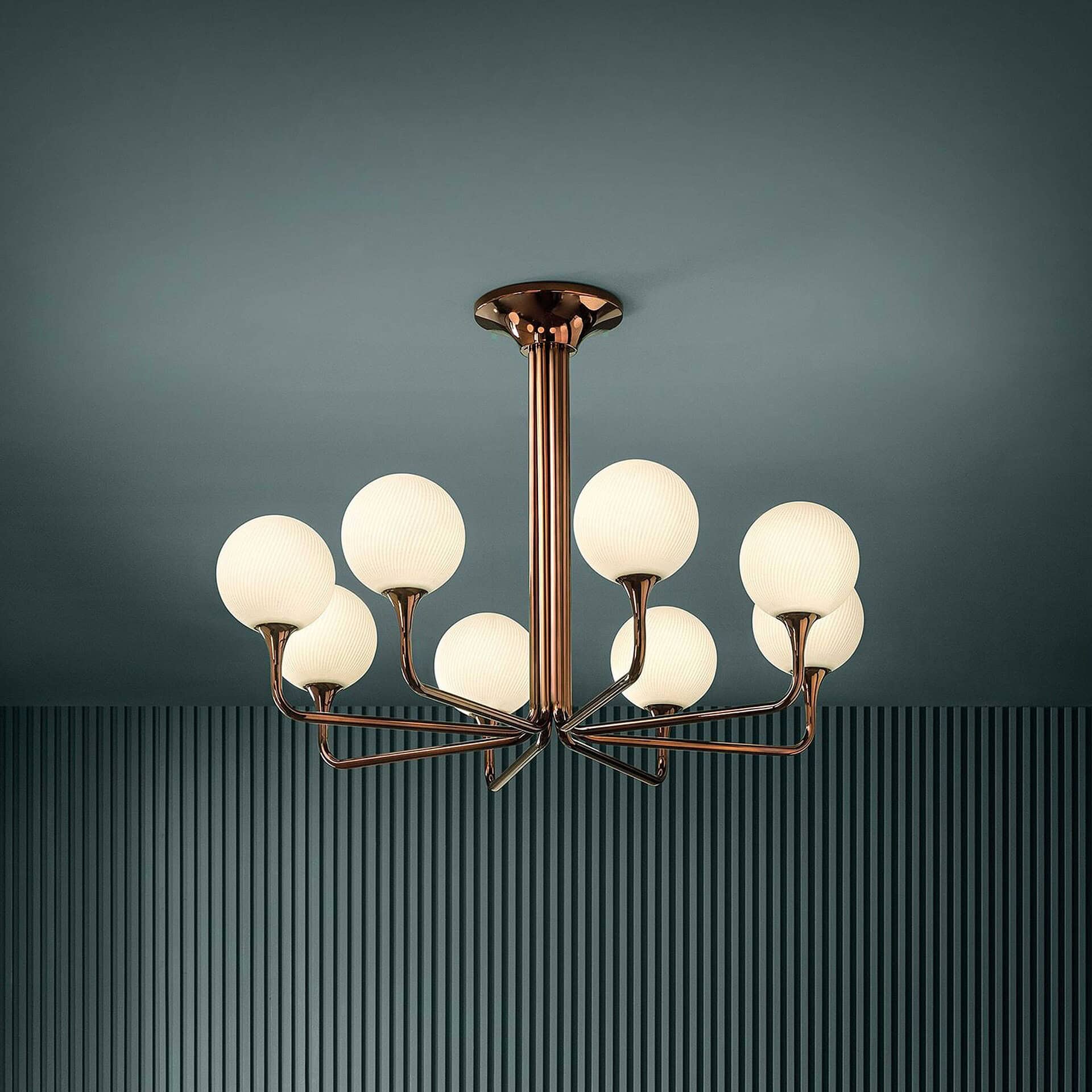 The Tee Round Ceiling is a stunning piece of modern art that is sure to add a unique touch to any room. Its curved form is crafted with precision and elegance, making it an eye-catching statement piece. The light spheres are connected on organically shaped stems, reminiscent of the graceful calla lily flower. Its galvanized metal frame and Murano triplex glass diffuser make it a long lasting and durable lighting option.