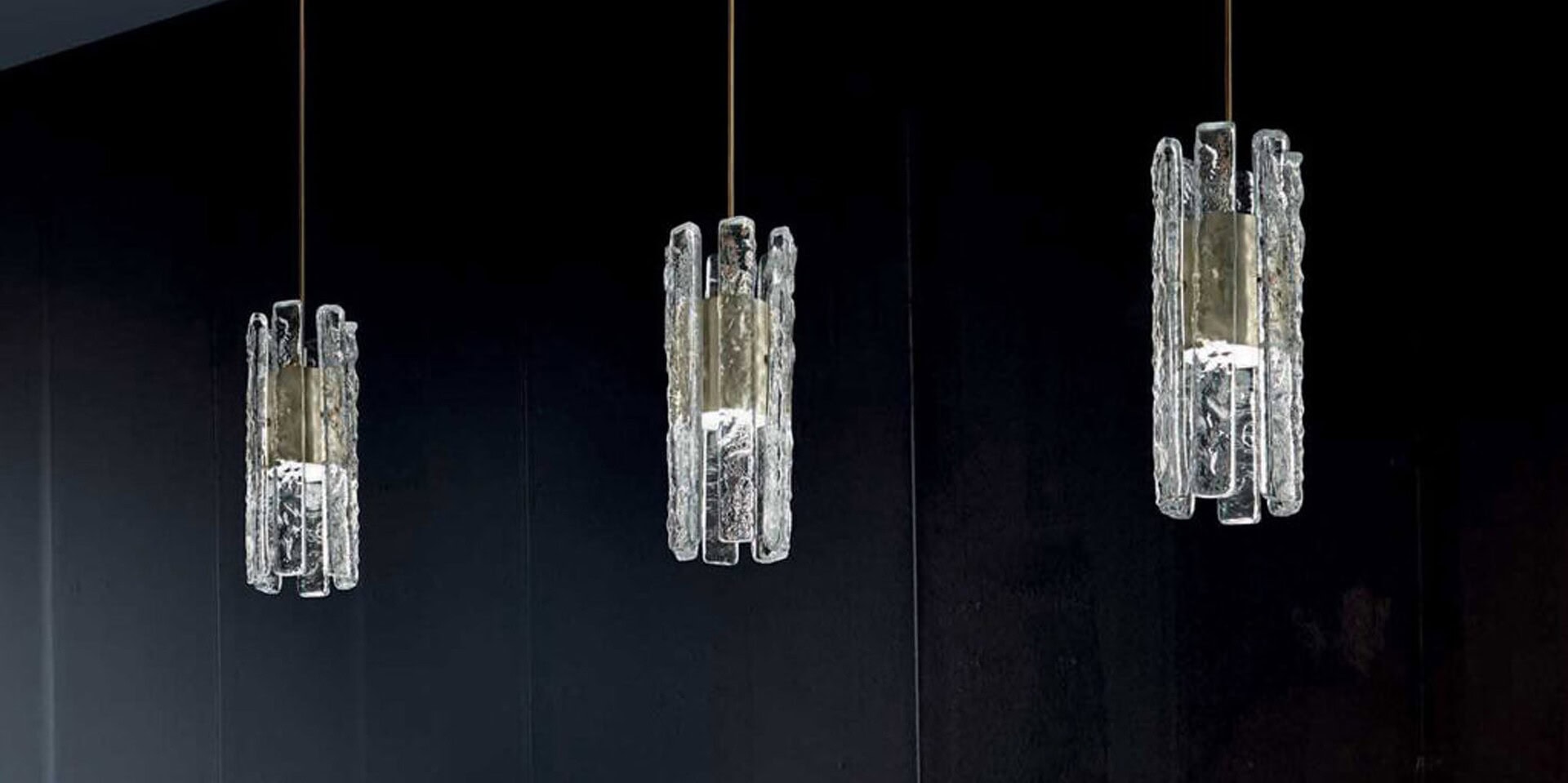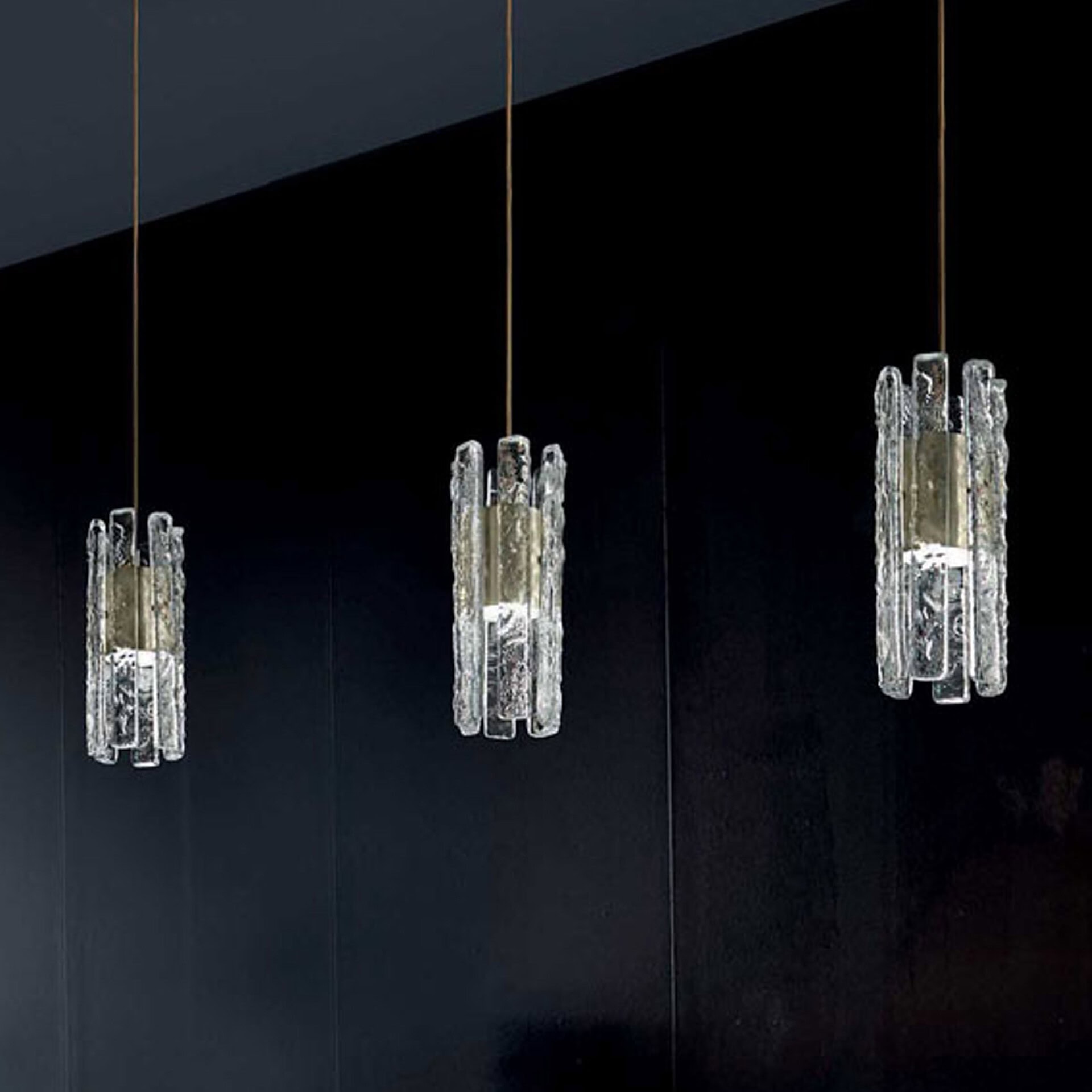 Featuring a unique combination of metal and glass, the lamp is accented by a plexiglass diffuser housing powerful LED lights. The glass outer layer is formed with a special technique using high temperatures, creating an uneven glass surface that gives off a unique, precious effect when the light shines through. The inner structure of the lamp comes in a standard finish of champagne gold leaf, with custom finishes available on request for special projects.
