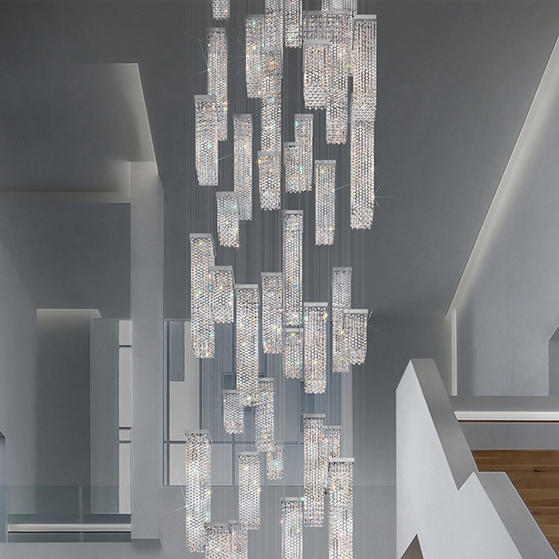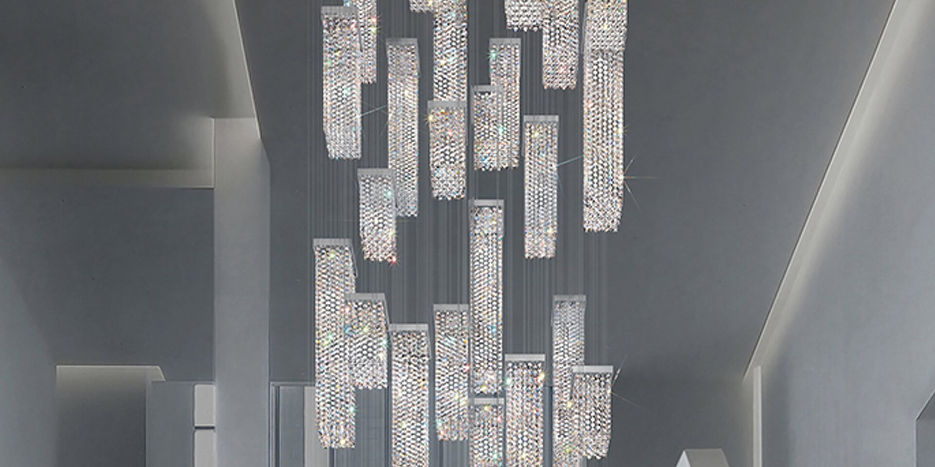 Elegant modern crystal chandelier with starburst design, ideal for luxury living room decor.