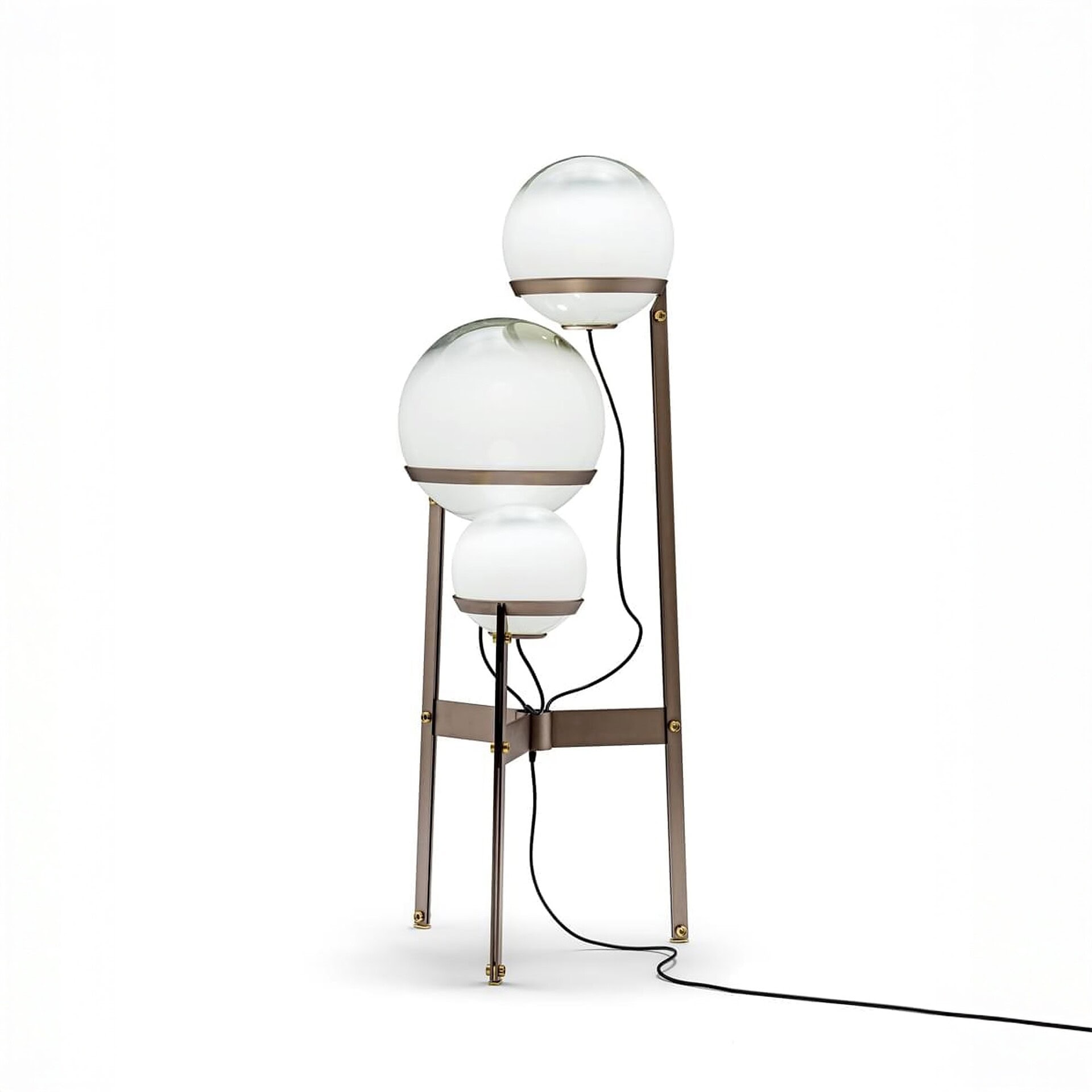 The Bubble-Bobble Floor Lamp by Arketipo captures the playful elegance of floating glass forms while maintaining the refined craftsmanship expected of Italian design. Three hand-blown glass spheres appear to hover along slender metal supports, creating a composition that feels both sculptural and light. The soft gradient transition of each globe—from opaque to transparent—adds depth and visual softness, allowing the lamp to diffuse light gently throughout the surrounding space.