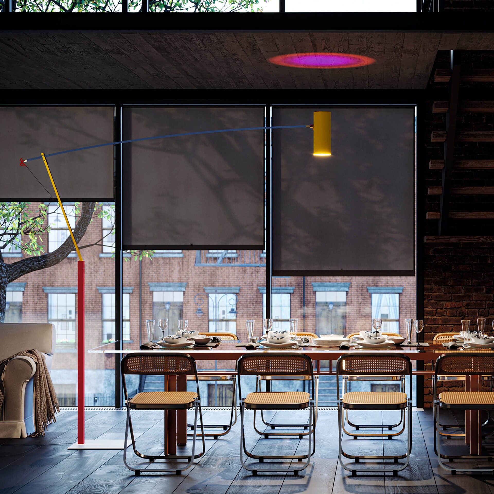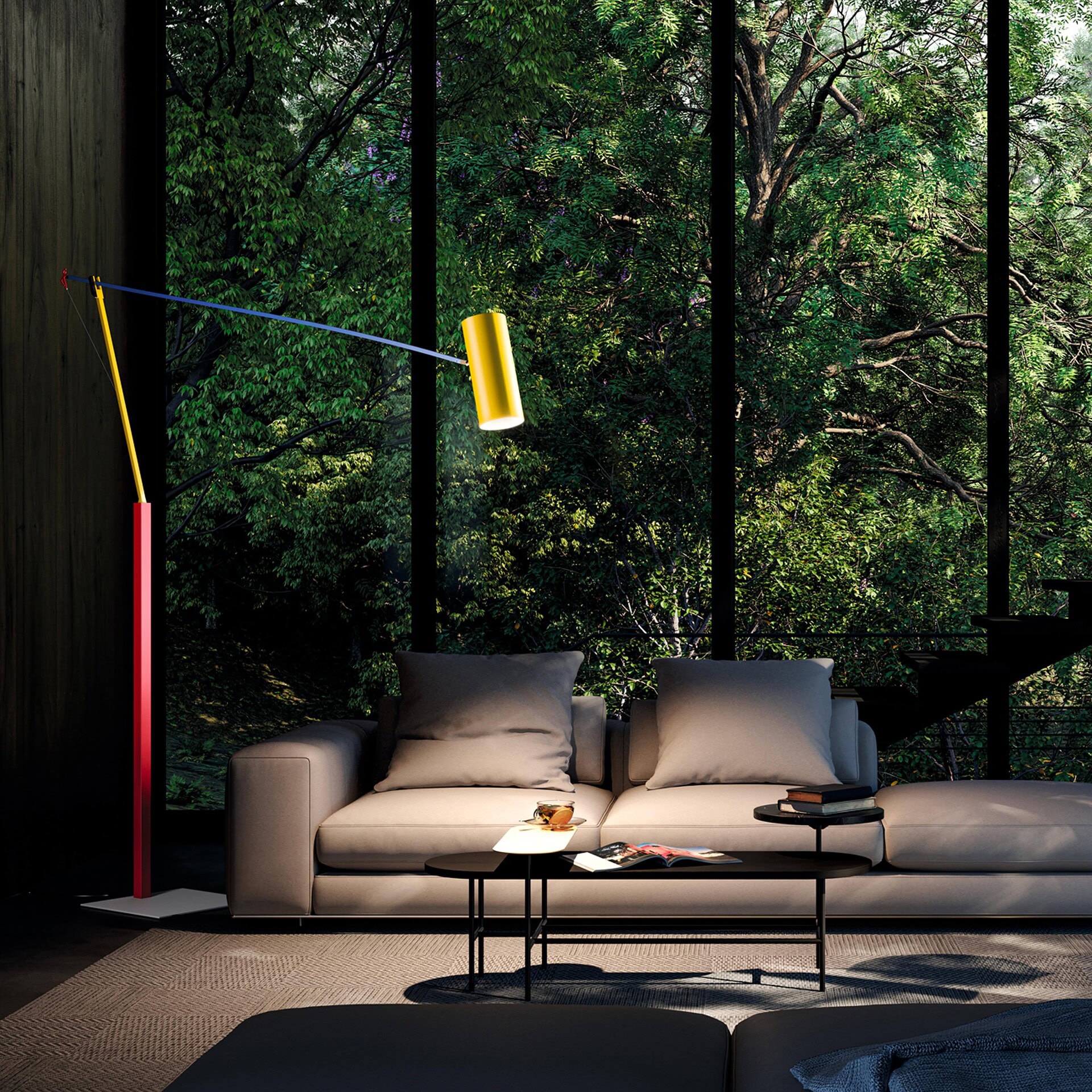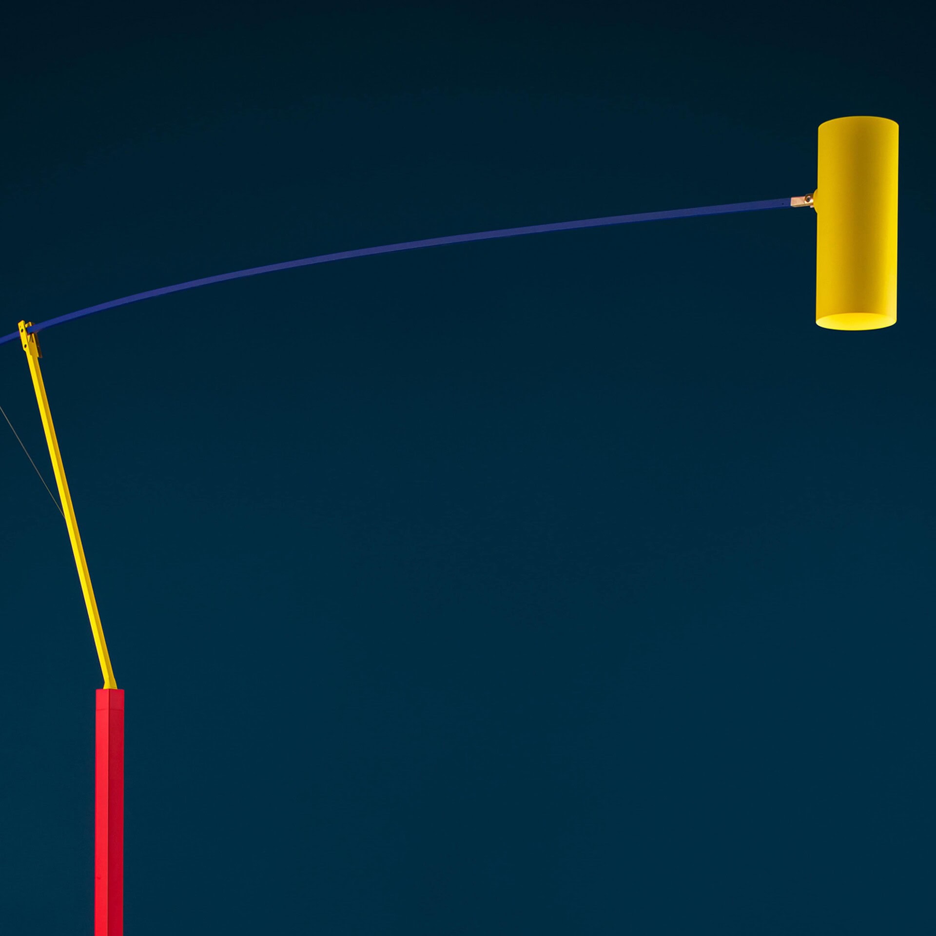 In addition to the classic black and white finishes, the "colorful" versions of Ettorino lamps combine blue, yellow, and red primary colours. The new articulated lamps feature a simple, rigorous design with surprising details, preceeded by the development of an innovative patent system. Red, dancing figures are the hallmark feature of all the lamps. Using a COB LED coupled with a very wide optical lens, Ettorino BIG is designed to illuminate a living room or a long table evenly thanks to its large size.
