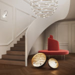 Using aluminum with an irregular internal surface covered in different finishes, Stchu-Moon 01 is a beautiful hemisphere-shaped LED floor lamp. There is a matte black finish on the exterior. Lamp holders are spoons made of steel that contain bulbs. The light is refracted off deliberately irregular surfaces, which multiplies their quantity, making the entire object a glowing light.