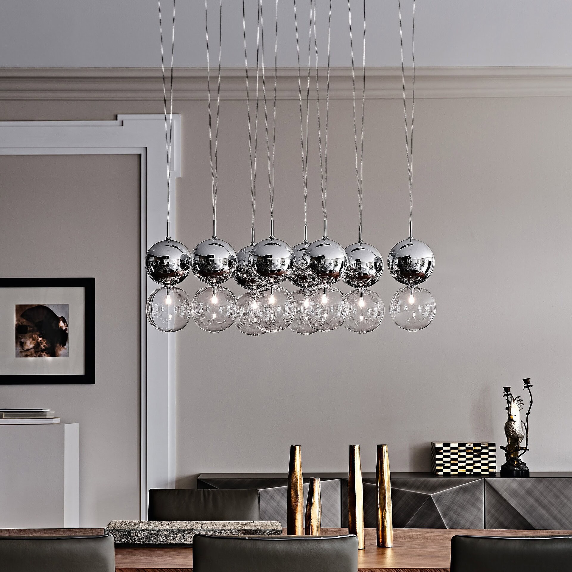 An illuminating statement piece suspended in air, the Apollo Ceiling Lamp brings sculptural balance and visual rhythm to any contemporary interior. Designed by Oriano Favaretto, this striking composition of borosilicate glass spheres floats gracefully above, diffusing light and elevating ambiance. Available in configurations ranging from a minimalist pair to a full cascade of sixteen globes, Apollo adapts to your space — be it over a dining table, in a dramatic foyer, or above a modern staircase.