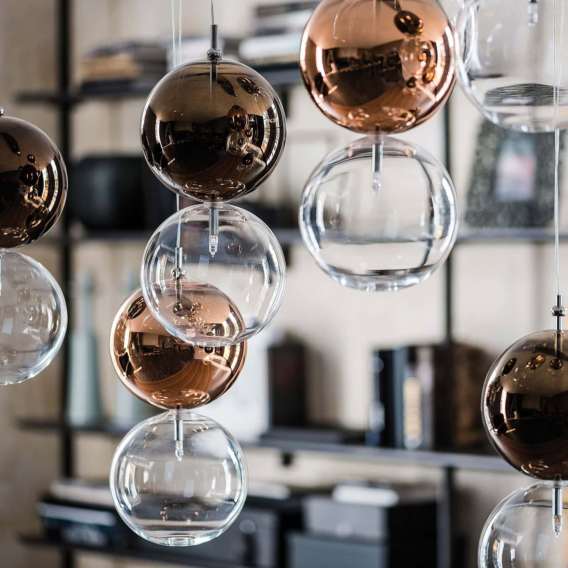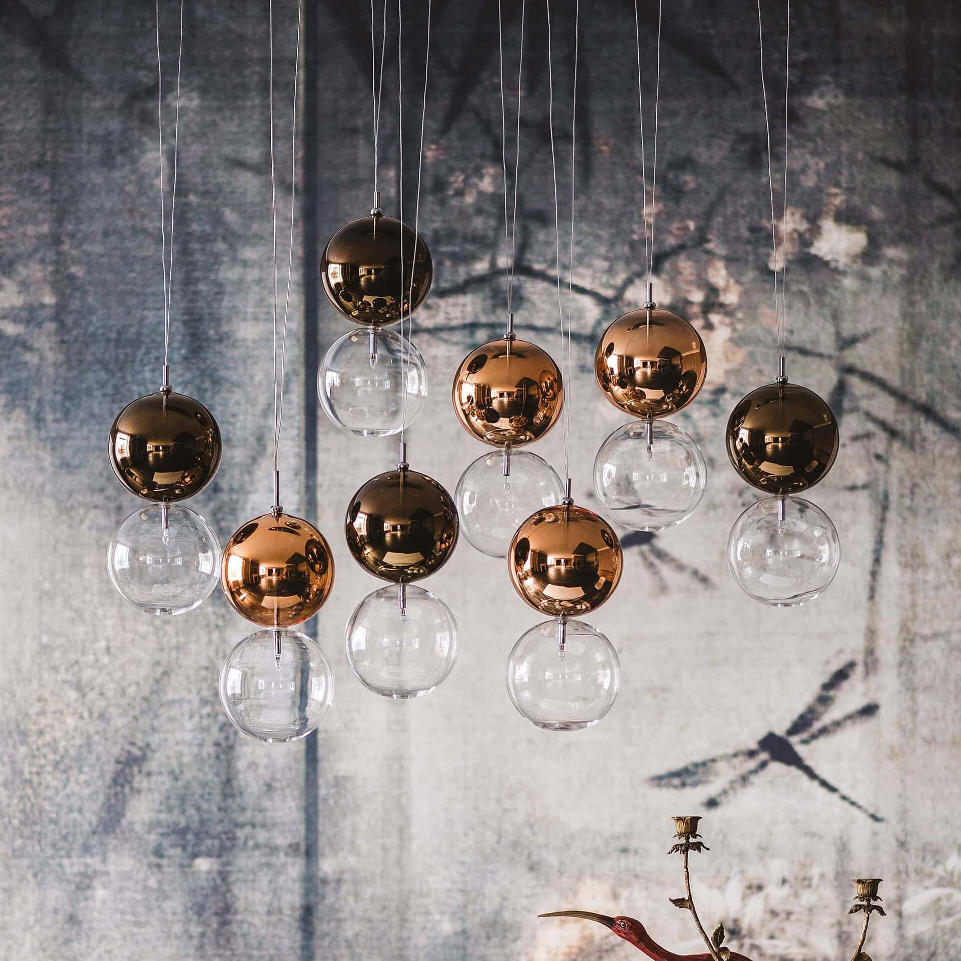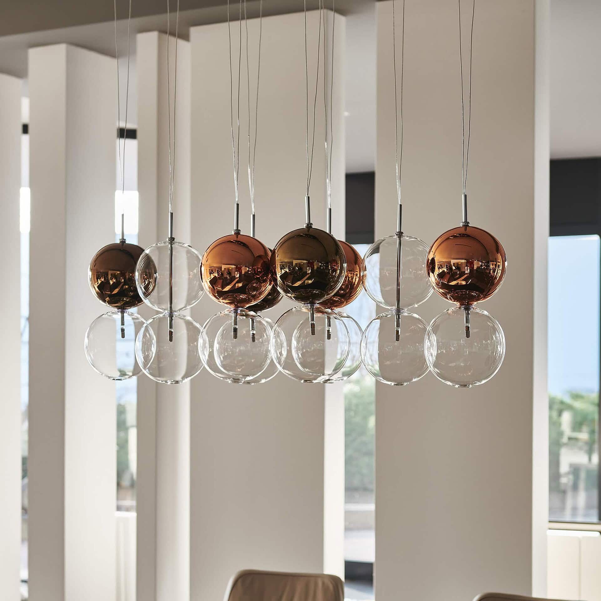 [vc_row][vc_column][vc_column_text css=""]Each pair of spheres includes a transparent lower globe paired with a painted upper globe in a warm metallic finish. This soft gradient of color creates a layered lighting effect that gently emphasizes surrounding furniture and textures. The modular ceiling mounts include round, oval, rectangular, and single-plate options to suit your layout and vision.[/vc_column_text][/vc_column][/vc_row]