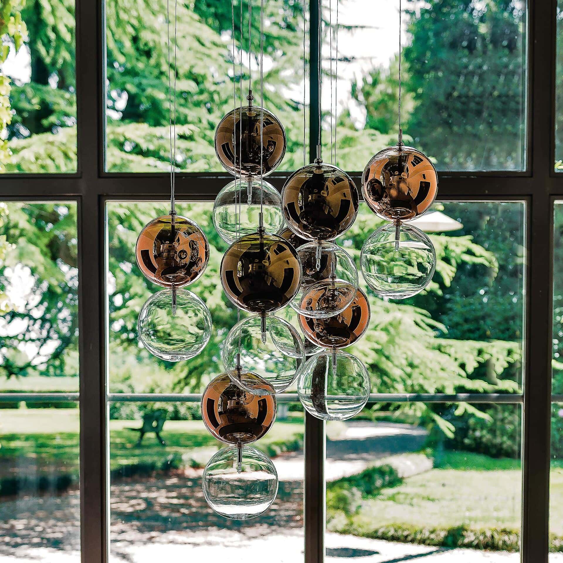 Upper Sphere: Available in transparent, painted chrome, bronze, or copper finishes