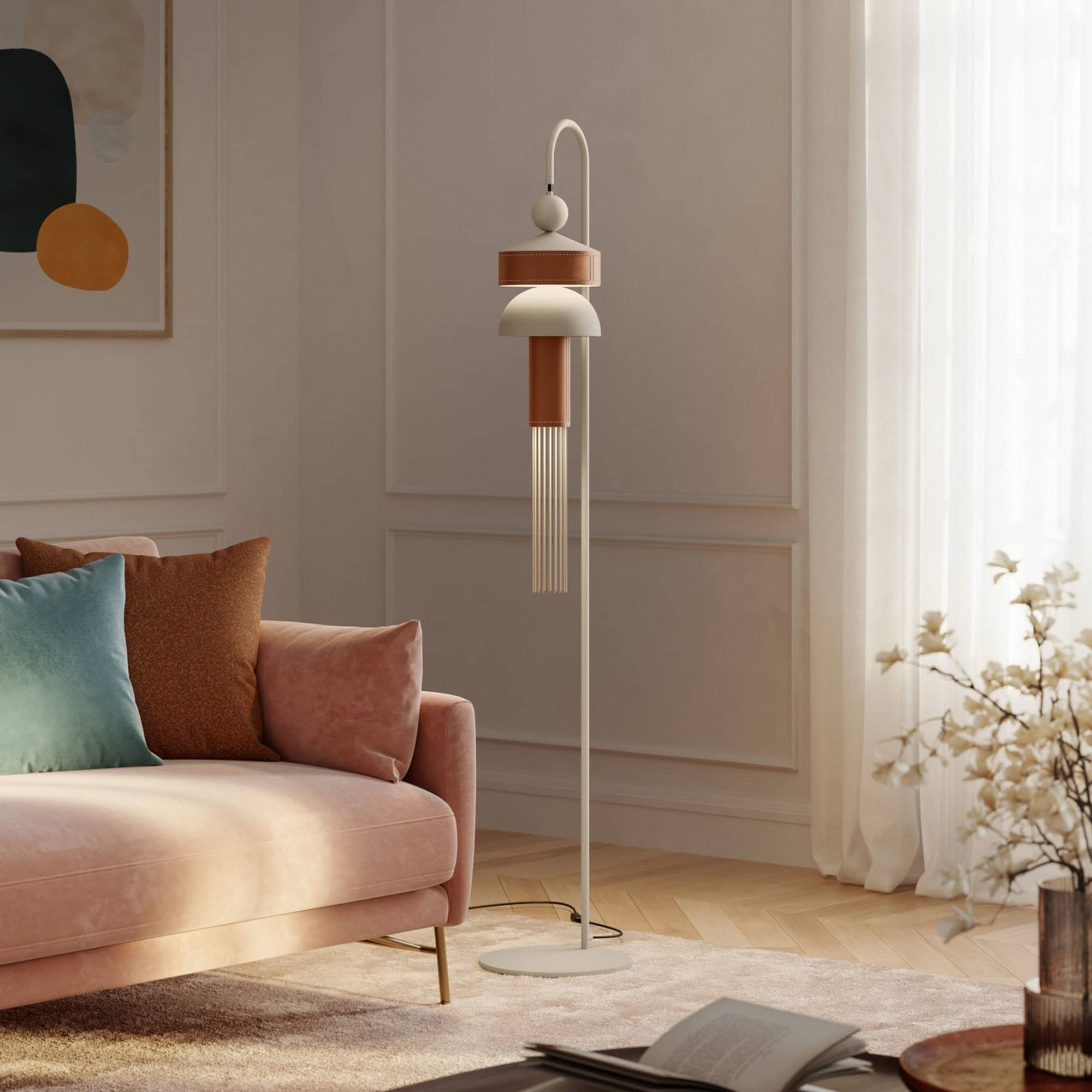 Introducing the Nappe XM1 Floor Lamp, a sophisticated evolution of the iconic Nappe collection by Masiero. This floor lamp embodies exquisite geometric layering and artisanal craftsmanship. Its vertical form is an elegant fusion of metal, leather, and fringe details, perfect for enhancing any interior with a touch of refined artistry. The lamp's sculptural design creates a welcoming ambiance, effortlessly harmonizing with soft textures and natural light in spaces that celebrate both contemporary and timeless aesthetics.