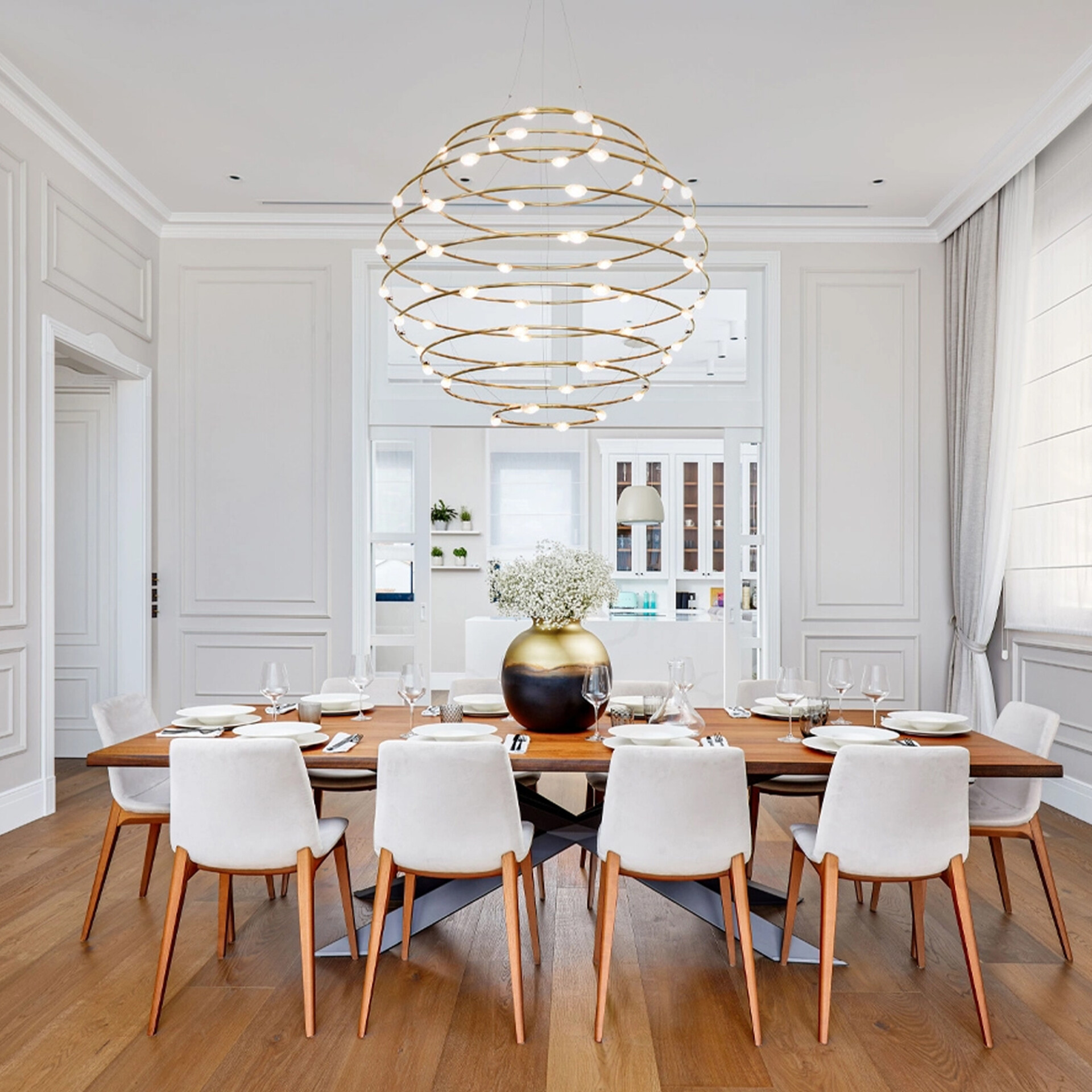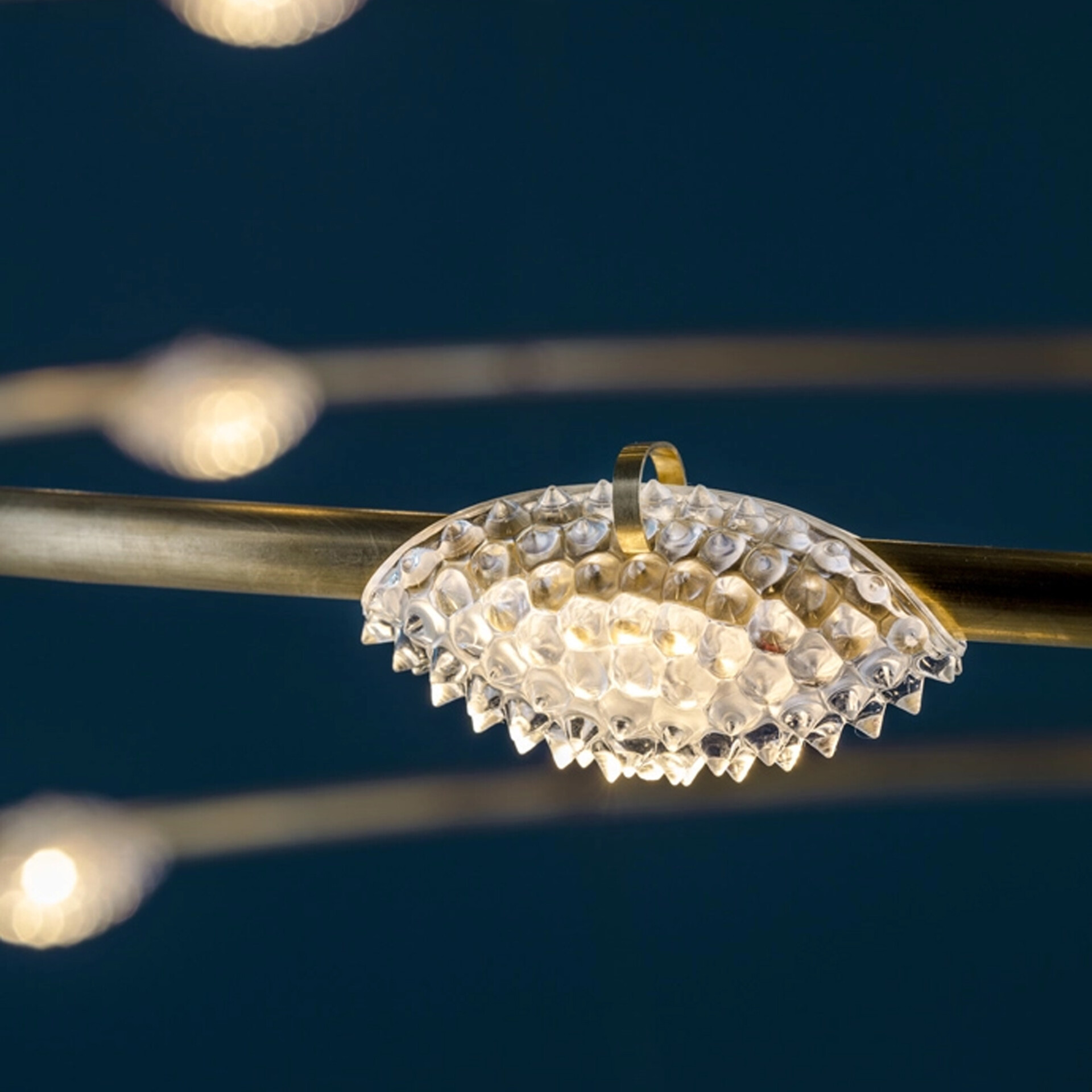 [vc_row][vc_column][vc_column_text css=""]Crafted with a white base and untreated brass rings, Petits Bijoux features 28 integrated LED light sources delicately enclosed in transparent covers with brass clips. The suspended sphere measures approximately 75 cm in diameter and hangs from a 200 cm adjustable cable. The LED system emits a warm 2700K glow with a CRI of 90, providing ambient lighting with a soft yet impactful presence. Dimmable via IGBT/Triac, this pendant is compatible with both 230V and 110V systems, offering elegance with functional versatility.[/vc_column_text][/vc_column][/vc_row]