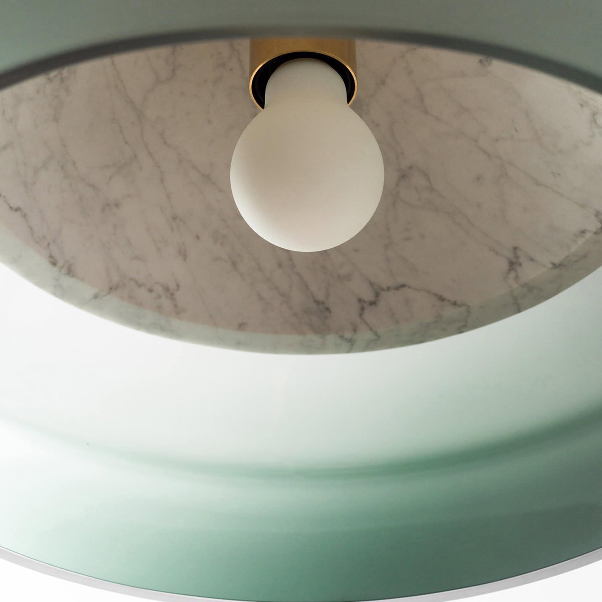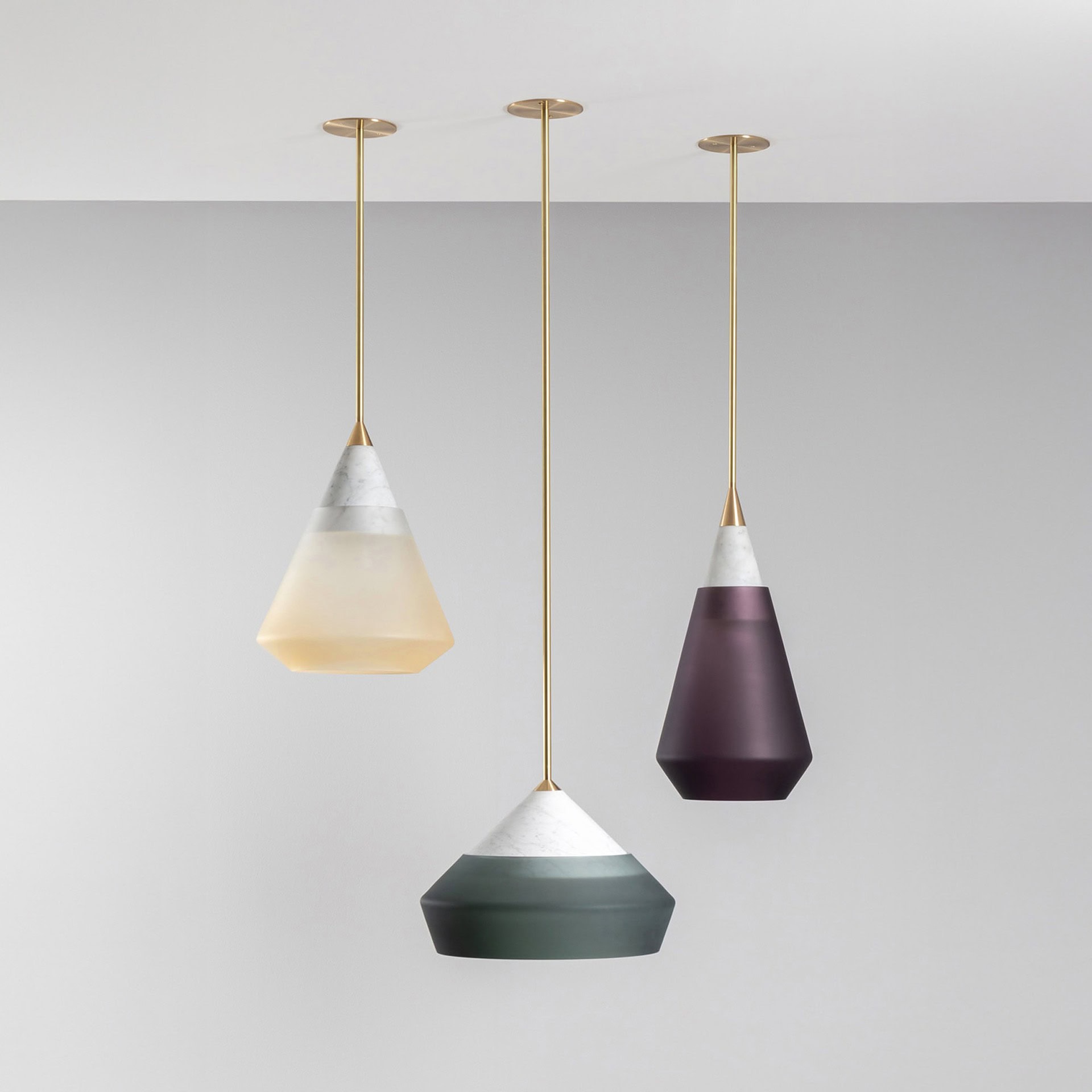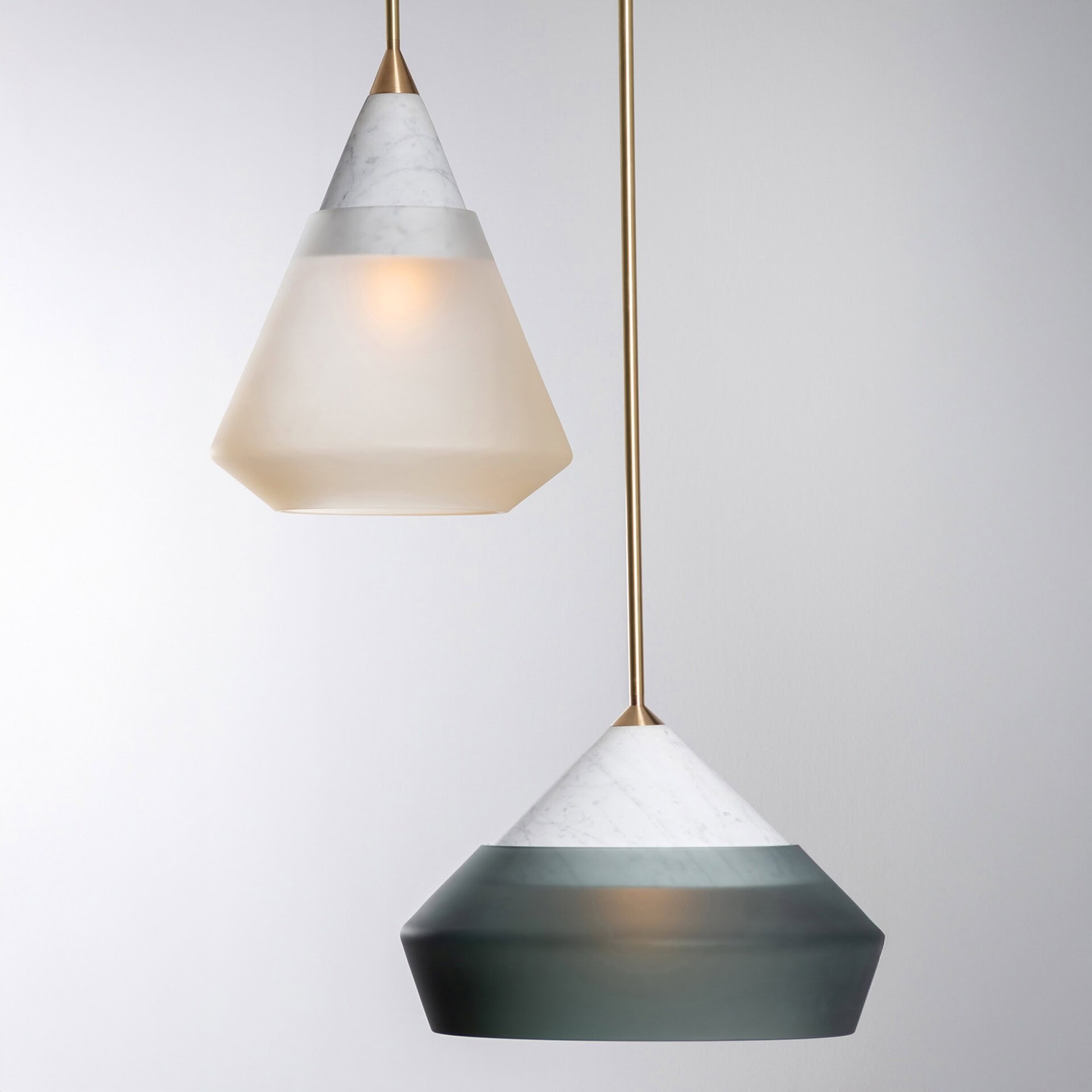 The Rest Light Pendant blends honed marble, frosted handblown glass, and warm brass for a timeless, sculptural presence. Each conical marble base supports an angular glass shade that softens the light, topped with a custom brass finial and suspended from a rigid brass stem. Offered in three distinct forms, the pendants share a refined design language, making them ideal alone or grouped together.