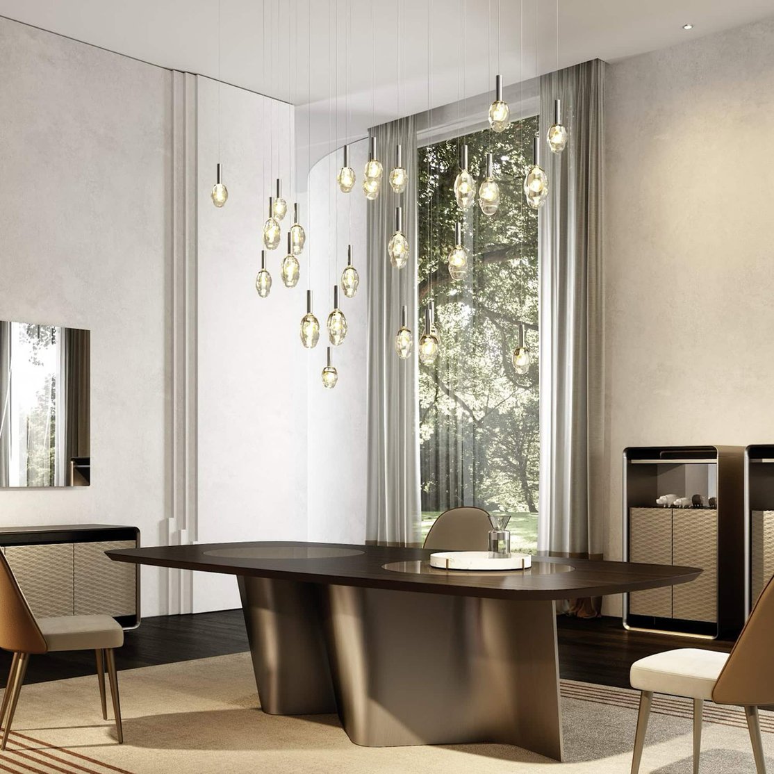 Available as a single pendant or in dramatic multi-light arrangements of up to 41 elements, the Sassi adapts seamlessly to both minimalist and elaborate settings. Integrated LED technology ensures energy efficiency while highlighting the radiant tones of the glass, offering a perfect balance of tradition, innovation, and timeless elegance.