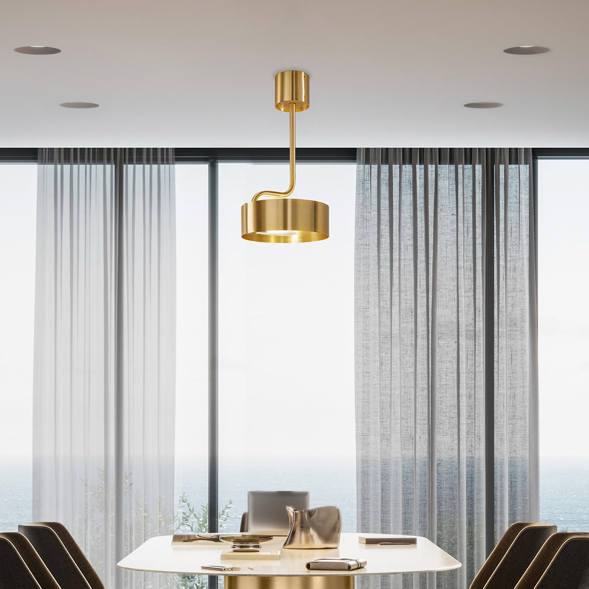 Designed for flexible illumination, the Sound S1 Pendant Light accommodates both halogen G9 bulbs and high-performance LED options. The integrated LED version provides balanced up and down lighting—each delivering 650 lumens in a soft 3000K or 553 lumens in a cozy 2700K, each with a CRI over 90 for exceptional color fidelity. With support for TRIAC (when using dimmable bulbs) and versatile 1-10V or PUSH dimming for LED models, users can easily tailor the light to any mood. Available in Matt Black, Brushed Gold, and Brushed Brass, the Sound S1 Pendant enchants with its sculptural form and timeless finishes.