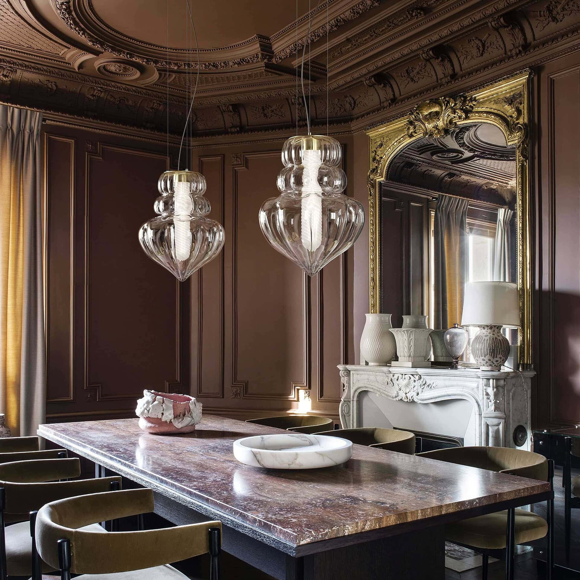 Discover the Vallonné Suspension Lamp, a masterful blend of Venetian crystal artistry and dynamic design. Each piece is mouth-blown, skillfully etched with precise lines, casting geometric shadows through its transparent crystal and elegantly tapering to its concealed light source.