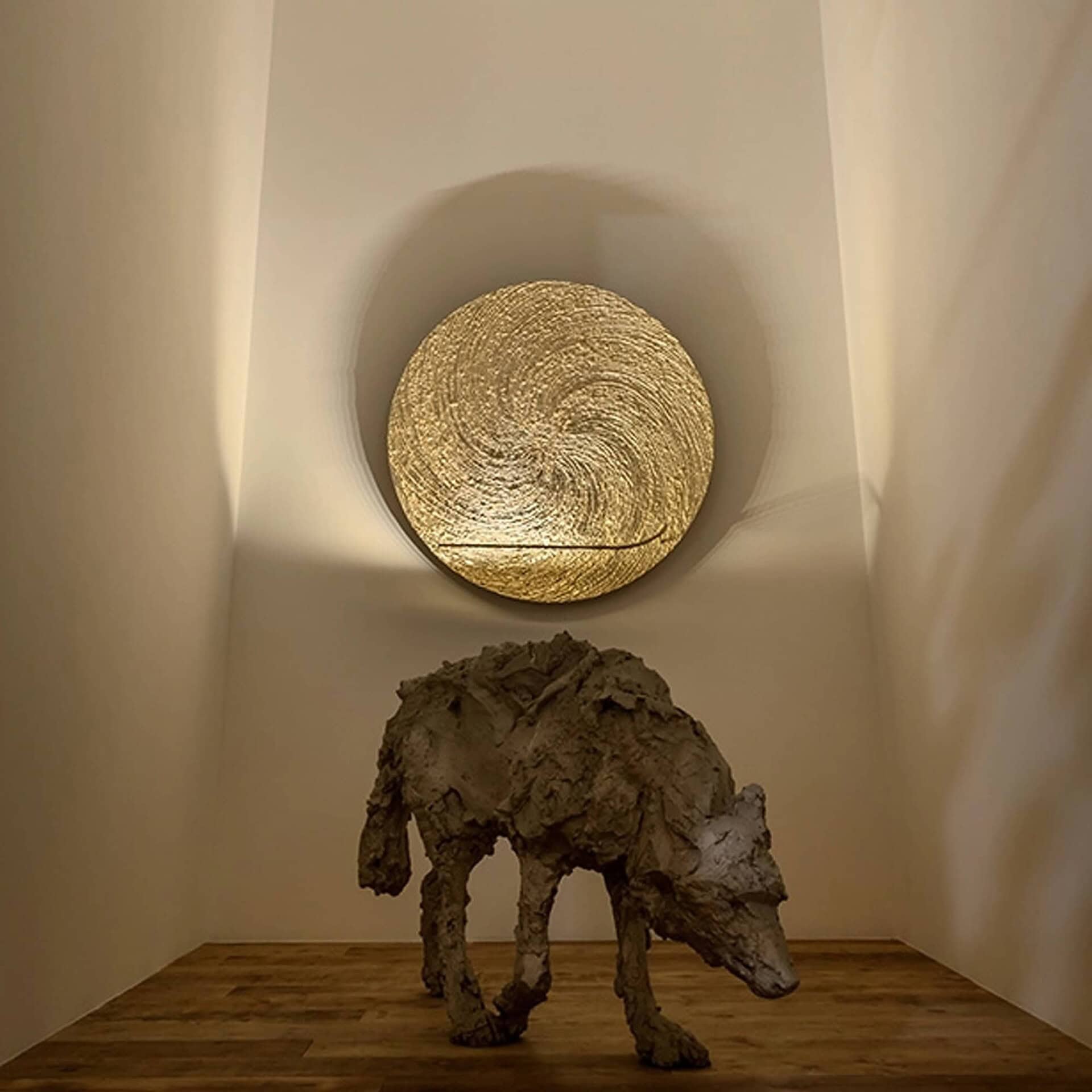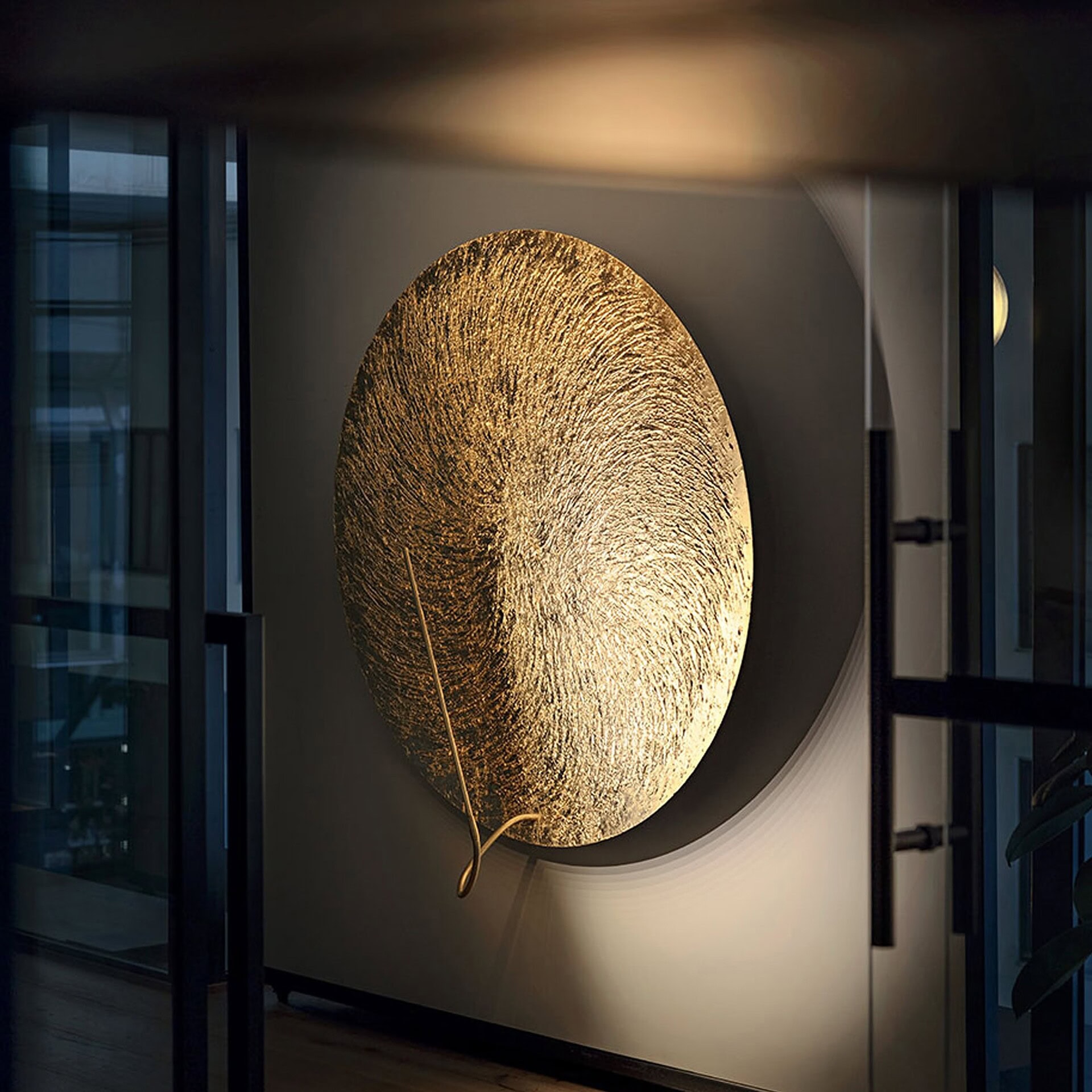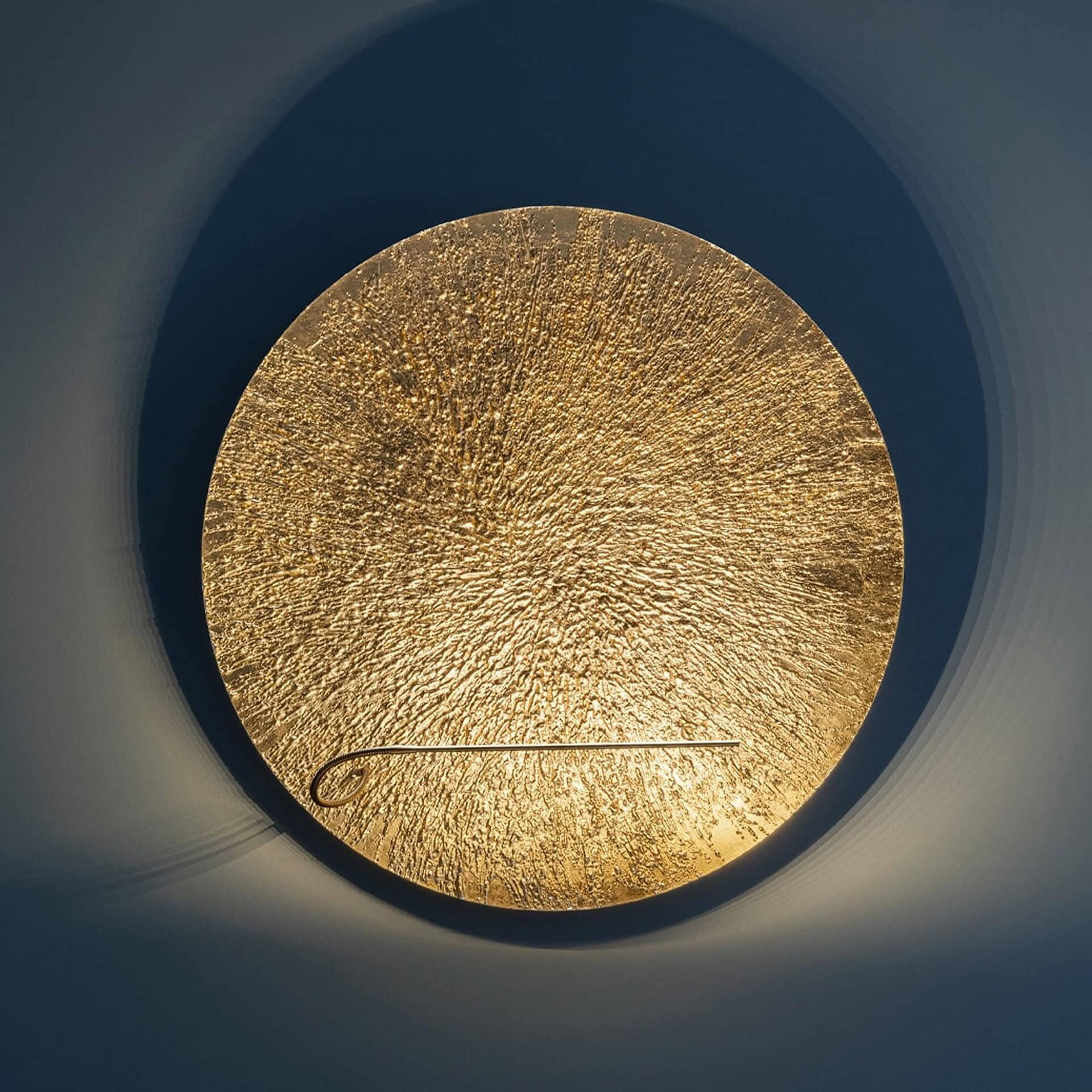 The Bellatrix Wall Lamp is a sculptural lighting piece that radiates presence and elegance. Featuring a dramatic 120 cm aluminum disc with a textured, irregular surface, it is finished in hand-applied gold leaf for a warm, reflective glow. The bold disc is backed in blue and mounted on a clean white base with a flexible brass arm, creating a layered composition that combines metallic richness with graphic contrast. More than a light source, Bellatrix acts as a luminous wall sculpture, ideal for statement-making interiors.