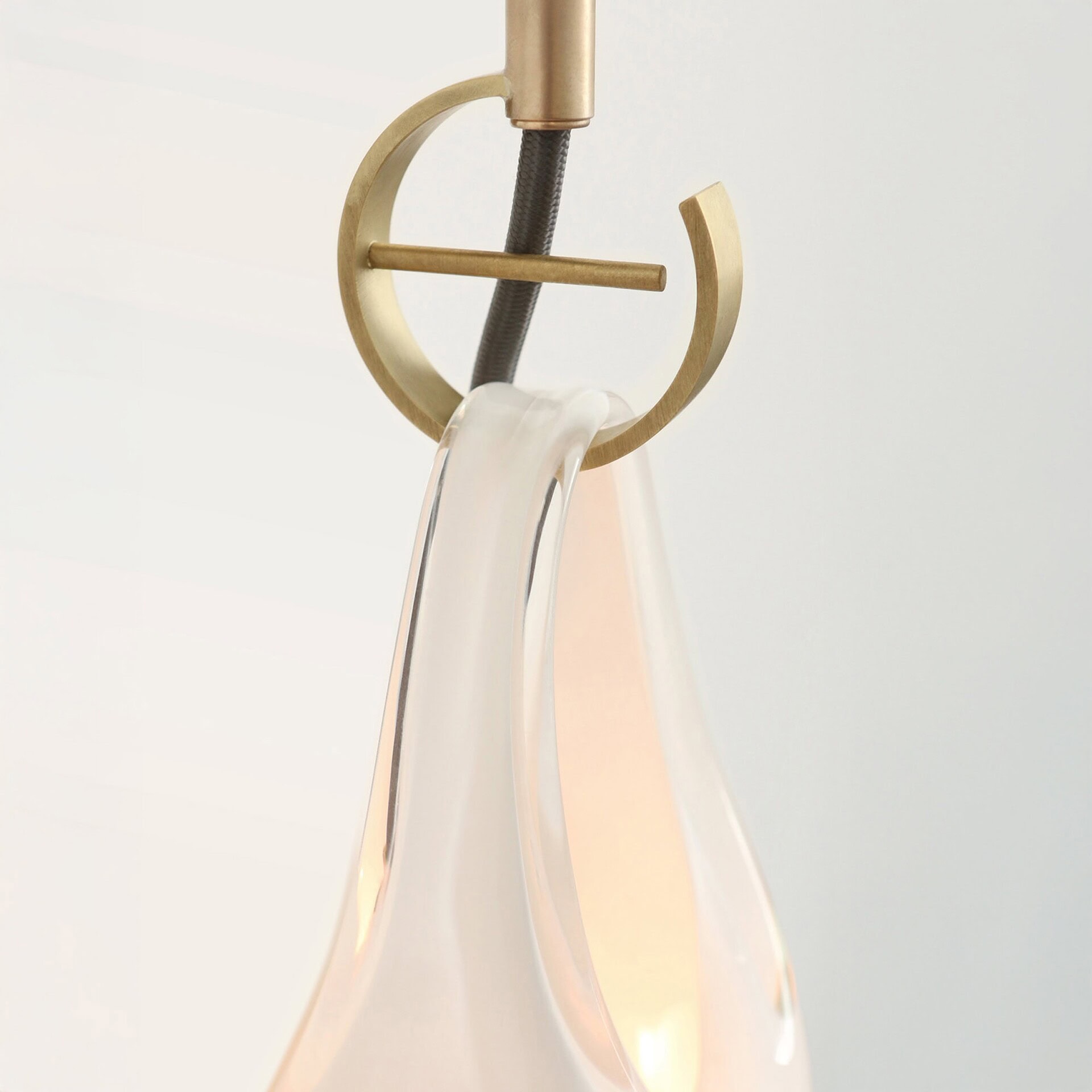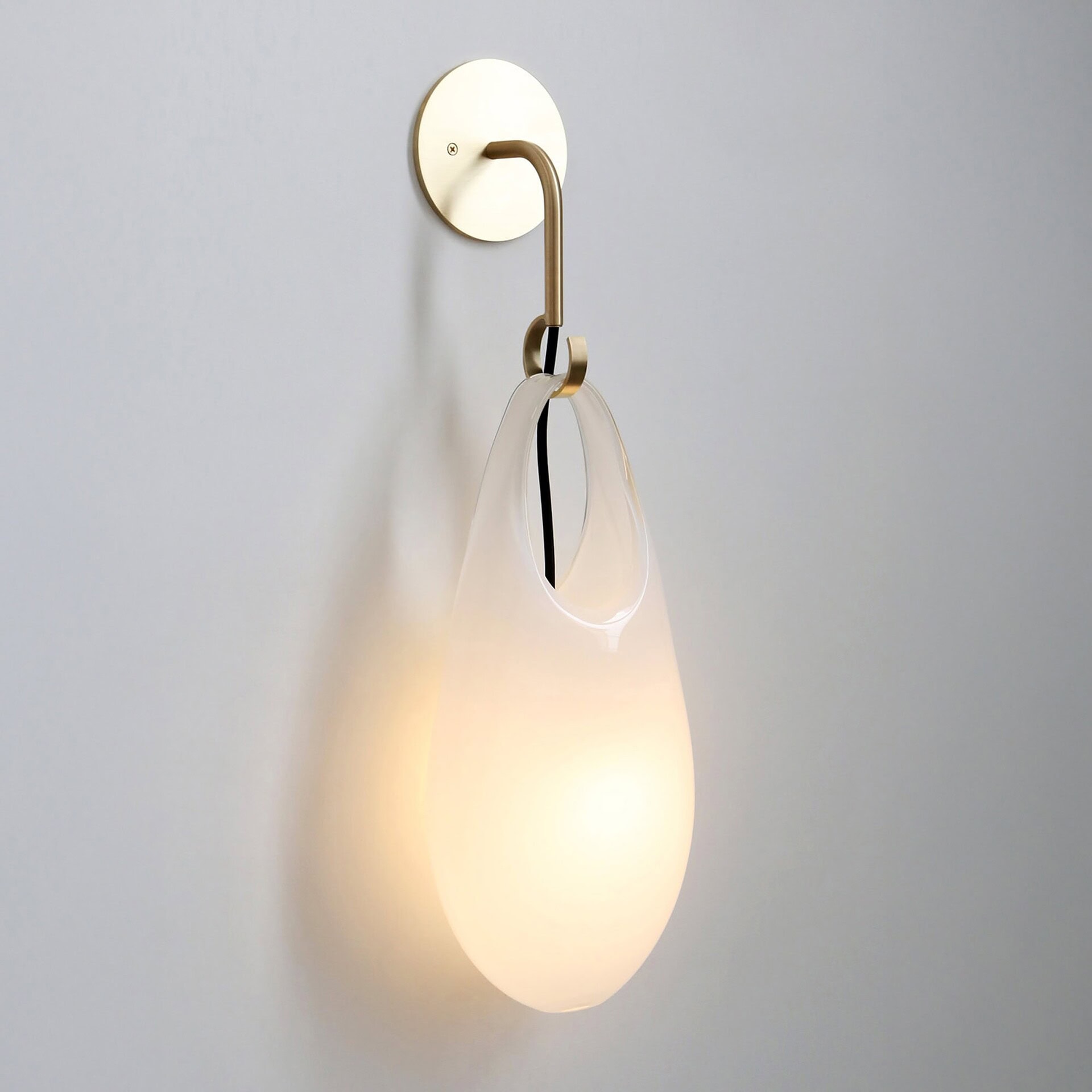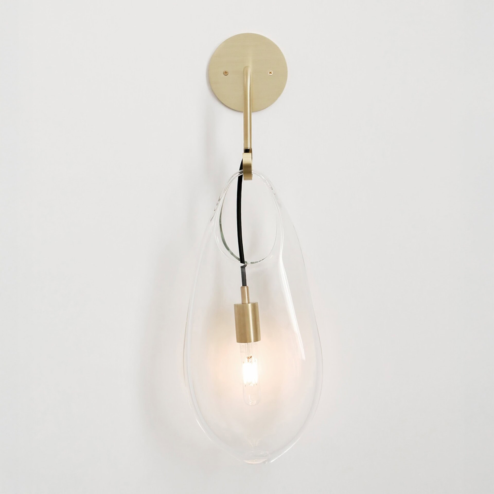 The Hold Sconce by SkLO is a sculptural lighting statement defined by fluidity and tension. Its signature feature—a handblown glass vessel that appears to stretch and drip from a solid brass hook—brings a sense of movement and modern artistry to the wall. Suspended delicately by a fabric-wrapped cord, the light source glows within the glass like a captured drop of molten material, creating an interplay of light and texture that elevates both contemporary and transitional interiors.