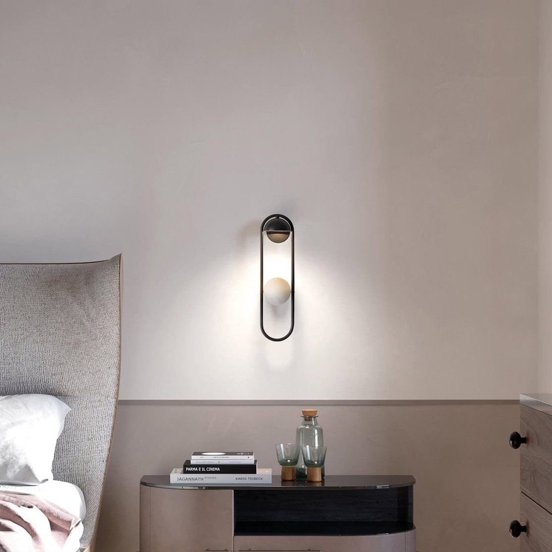 The Luppiter Wall Sconce is a captivating blend of modern artistry and functional lighting, designed to elevate any interior with its sculptural form. Featuring an oblong, painted metal frame, the fixture houses a half-sphere shade that gracefully directs light onto a white alabaster sphere. This creates a stunning interplay of light and shadow, enhancing the ambiance of any room. The sconce's open frame lends it an airy demeanor, allowing it to dazzle whether placed in a hallway, living room, or bedroom. Versatile in its installation, the Luppiter Wall Sconce can be mounted with the light directed either upward or downward to suit your design preferences.
