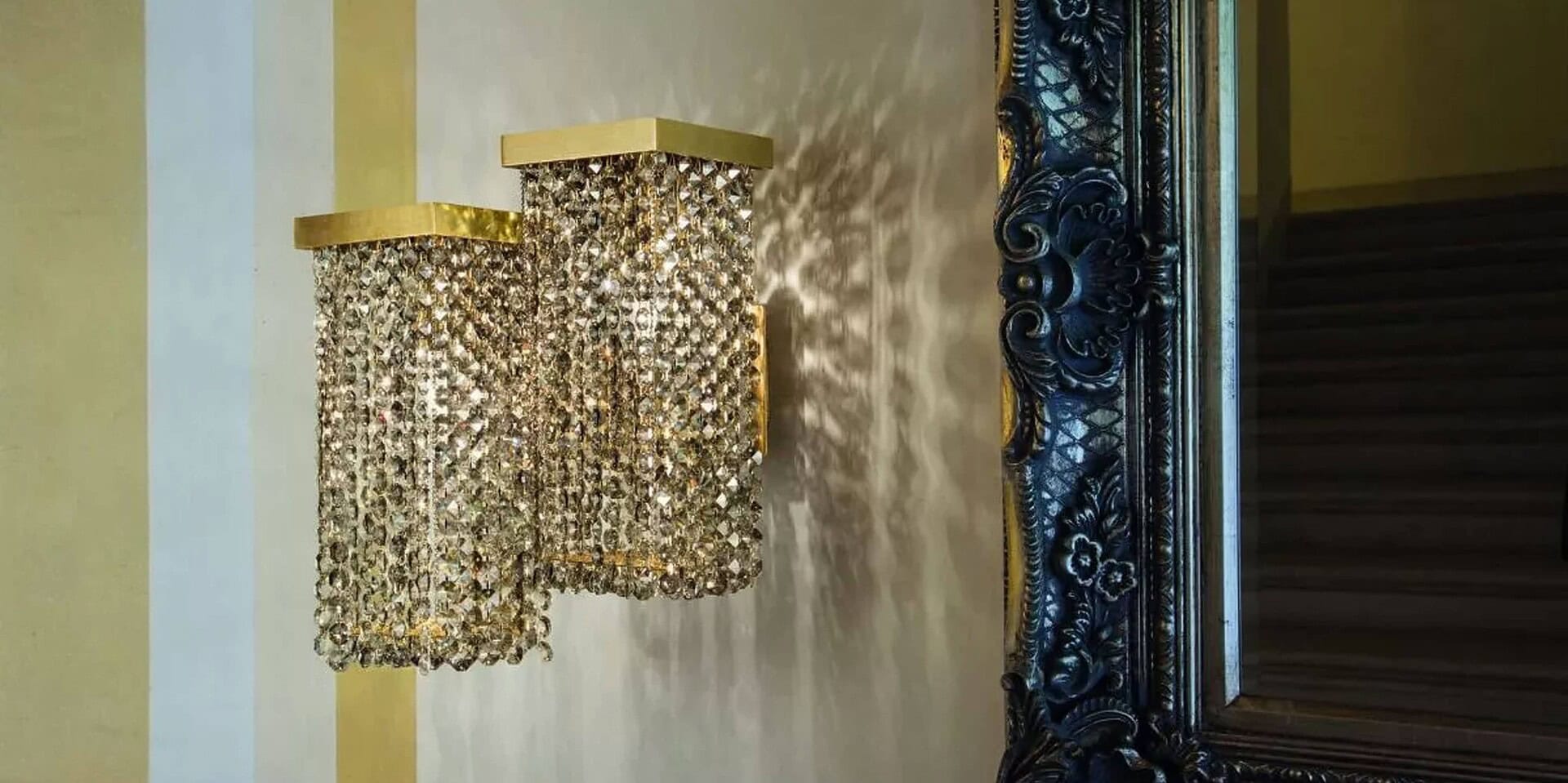 The Skyline A2 is a luxurious applique crafted with the highest quality crystal. Its sleek metal structure in a burnished brass finish exudes sophistication and elegance, while the smokey crystal pendants add a touch of modern glamour. This stunning fixture will add a touch of sparkle to any space, making it the perfect statement piece for any home.