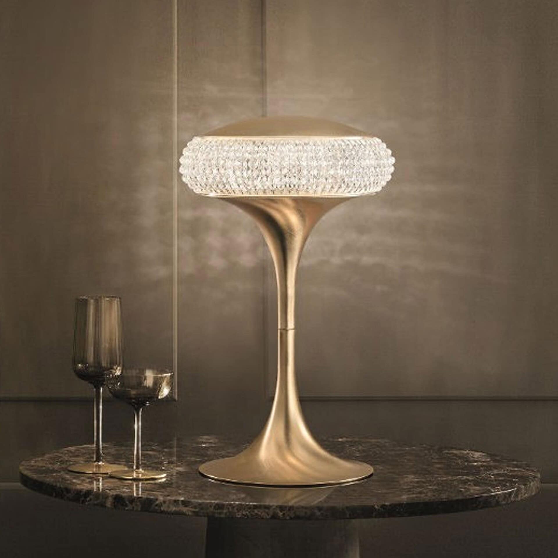 The Cristalis TL1 G table lamp will add a touch of elegance and sophistication to any home. Its metal structure is complemented by a beautiful diffuser composed of numerous crystal glass balls, adding sparkle and shine to any room. This lamp features a modern design and is sure to be a conversation starter. It provides ample lighting for any space, making it the perfect choice for a living room, office, or bedroom.