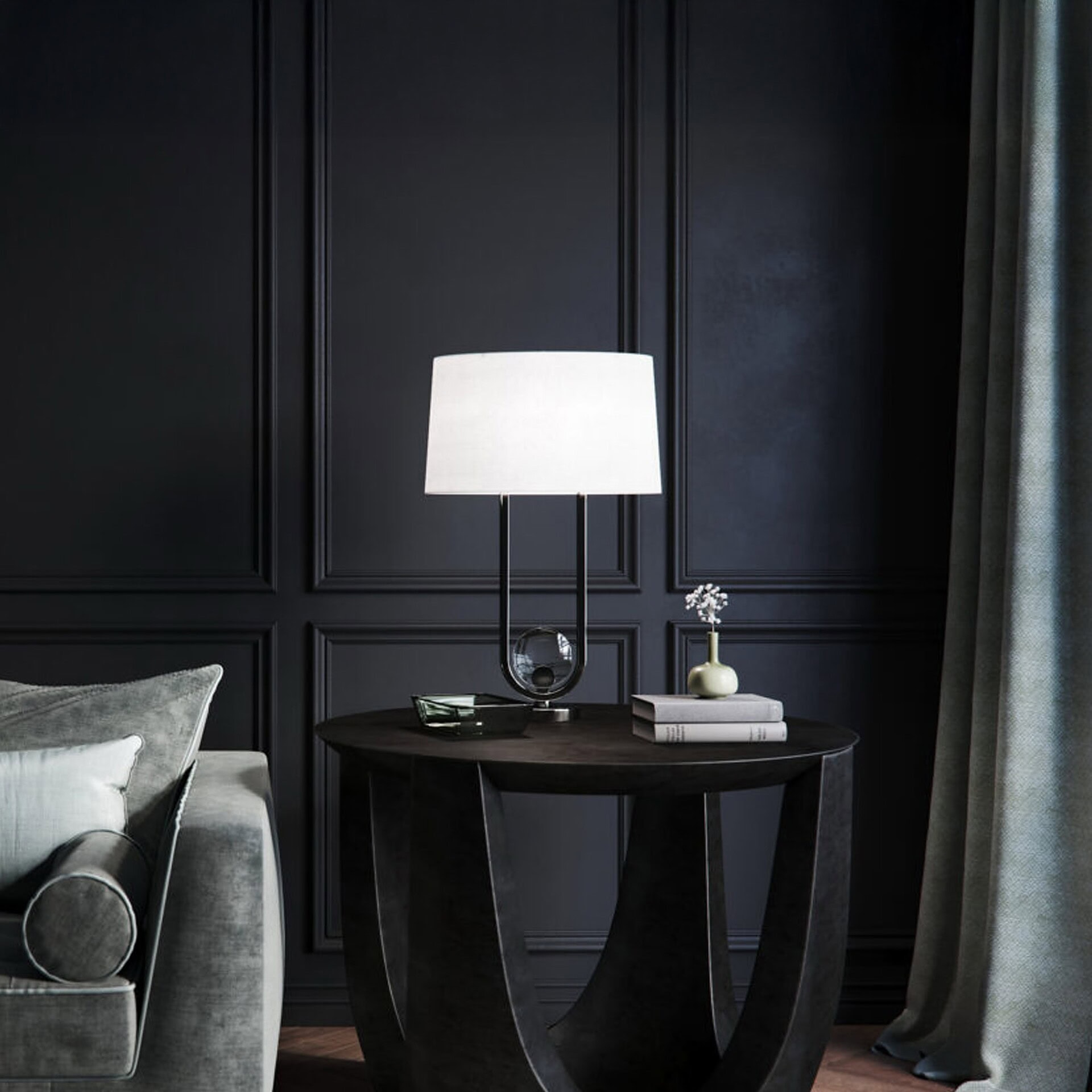 A tall clear glass bottle embellished with hand applied 'dollops' of navy blue glass, the Edge Lamp provides a one-of-a-kind light source for the contemporary home. Each piece is mouth blown individually, creating a unique pattern and coloring, and allowing the pieces to vary in heigh tup to 1.25" due to the unique nature of the product. The pieces is available with a secondary laguna body finish, and a tall white drum shade lined in cream cotton and microfiber. Warranted to meet or exceed industry standards.