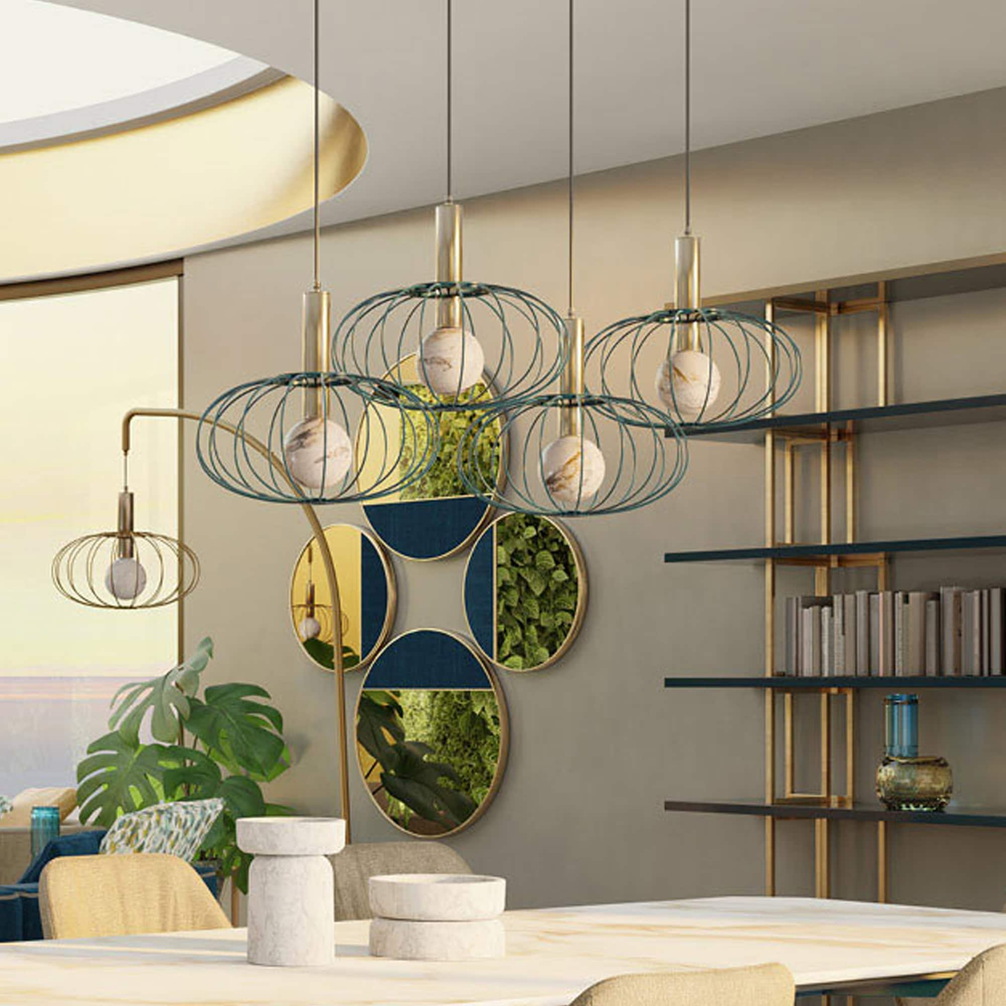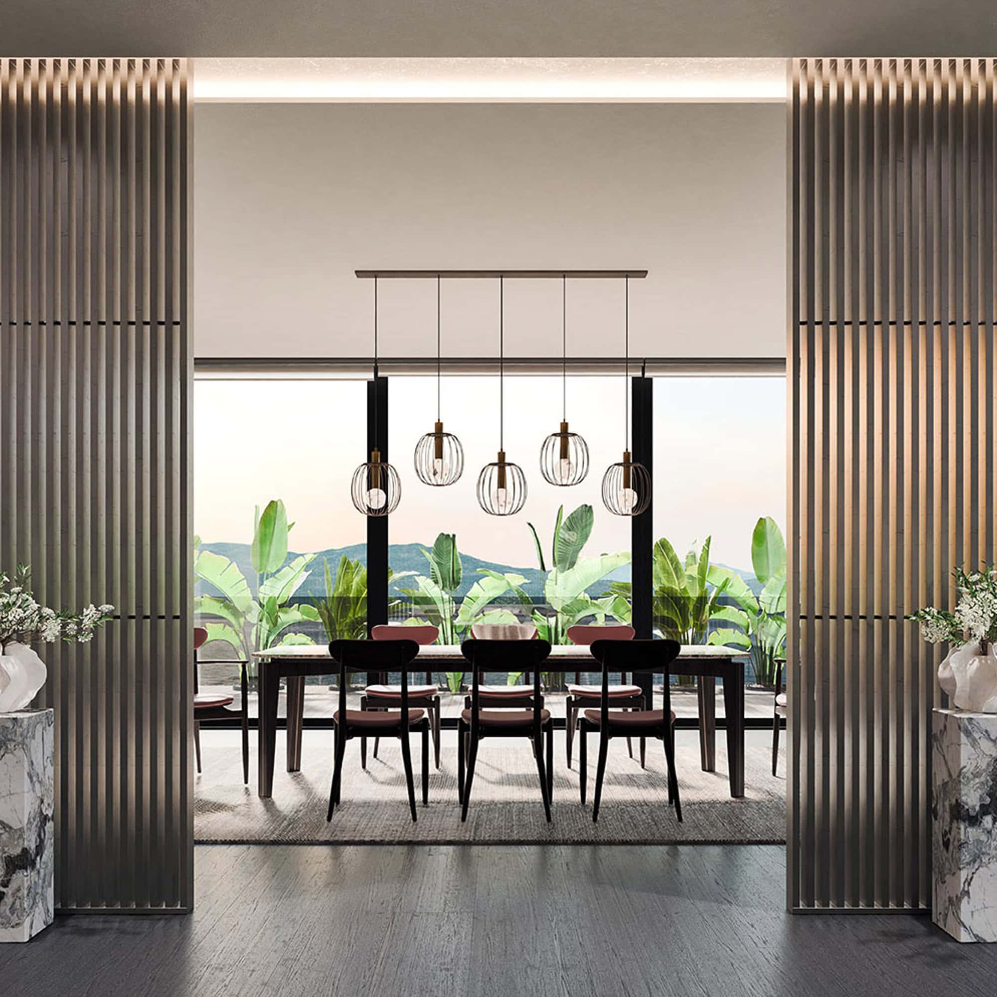 Elegant modern pendant lighting with glass orbs in a contemporary dining space.
