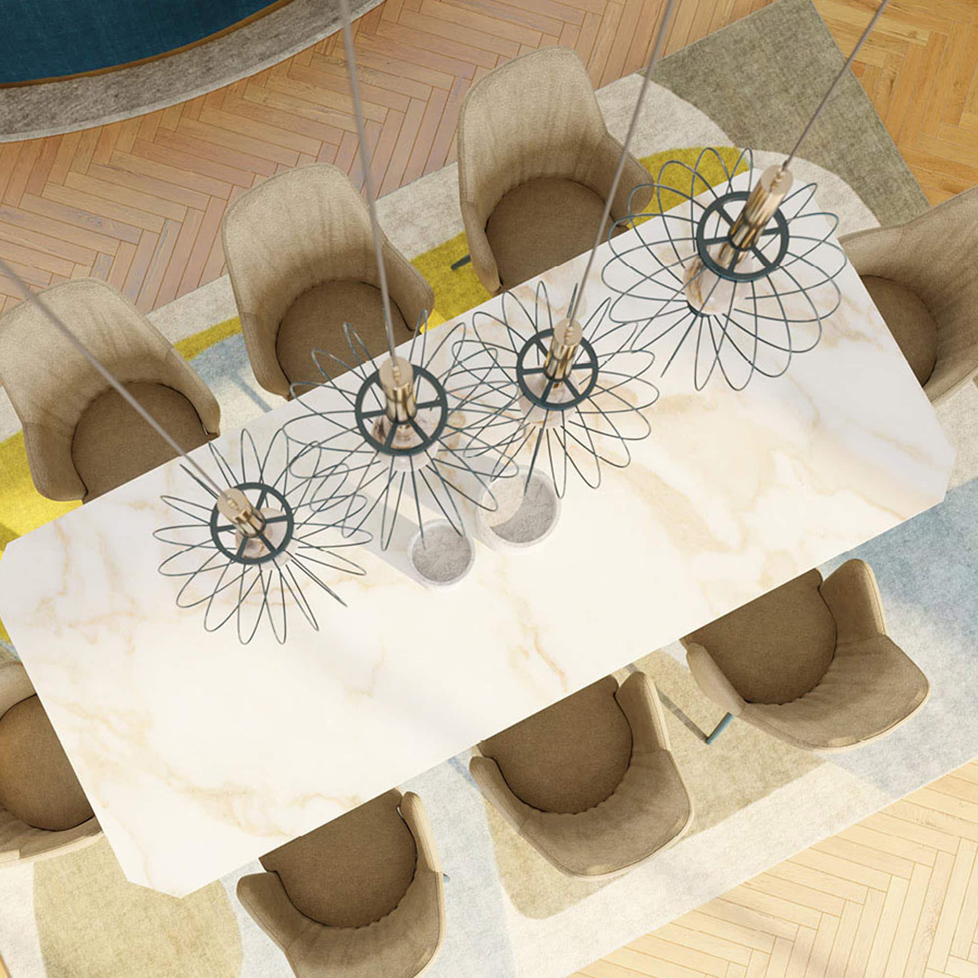 Colorful modern glass pendant lights with curved chrome accents hanging above a minimalist dining table.