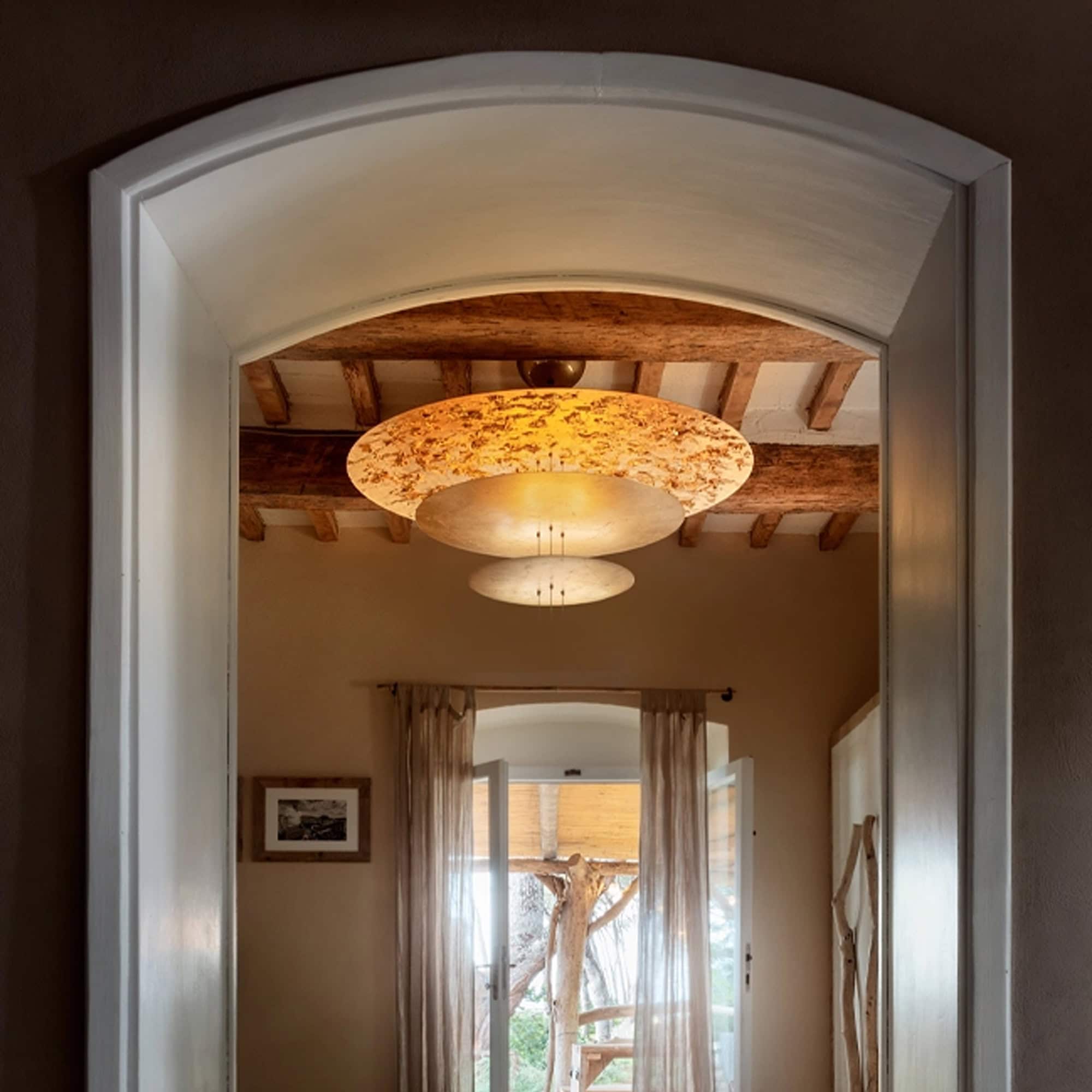 The Macchina della Luce Pendant Light is an architectural statement piece by Catellani & Smith, designed to embody the interplay of light and shadow. Crafted with a cascading series of leaf-lined discs, it creates a radiant, golden glow that transforms any interior into a dramatic focal point. The layered design captures and reflects light, evoking the grandeur of celestial forms while remaining versatile enough for both contemporary and classic spaces.