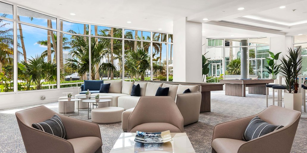 GALLERYone is a condo hotel that overlooks the intercoastal waterway at the Sunrise Bridge in Fort Lauderdale. The Highrise was built in 1986 and has 256 units, that are mainly one bedroom. The goal for this project was to update the common area spaces and create a warm and inviting feel by the water. The project included the front desk, a coffee area, the restaurant, and bar. Linda Paton, our Vice President of Customer Relations was the lead designer on the project.